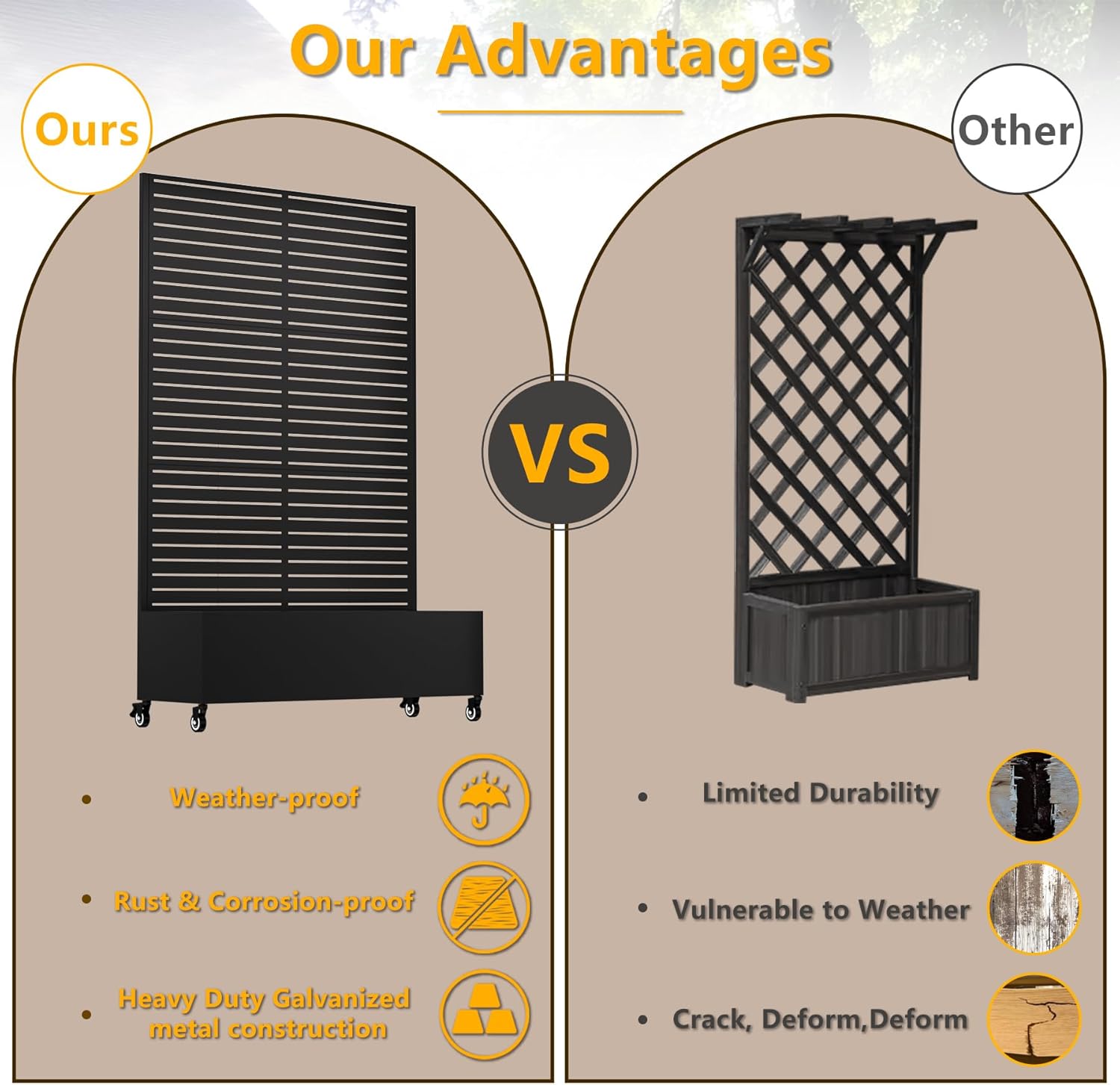 • 【3-in-1 Metal Planter Box with Trellis】This 72-inch tall metal planter box with trellis serves as an elevated garden bed for flowers, vegetables, and fruits, a sturdy support for climbing plants, and a stylish privacy screen to enhance any patio, lawn, or garden space. Perfect for versatile outdoor planting and decoration.