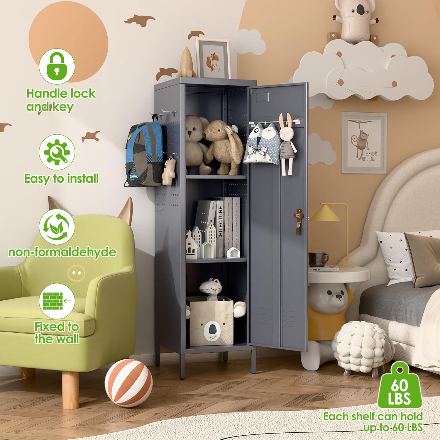 Metal Lockers for Employees with Handle,Metal Storage Locker with 2 Pegboard & 5 Hooks for Gym, School, Office,Home,Garage,Grey