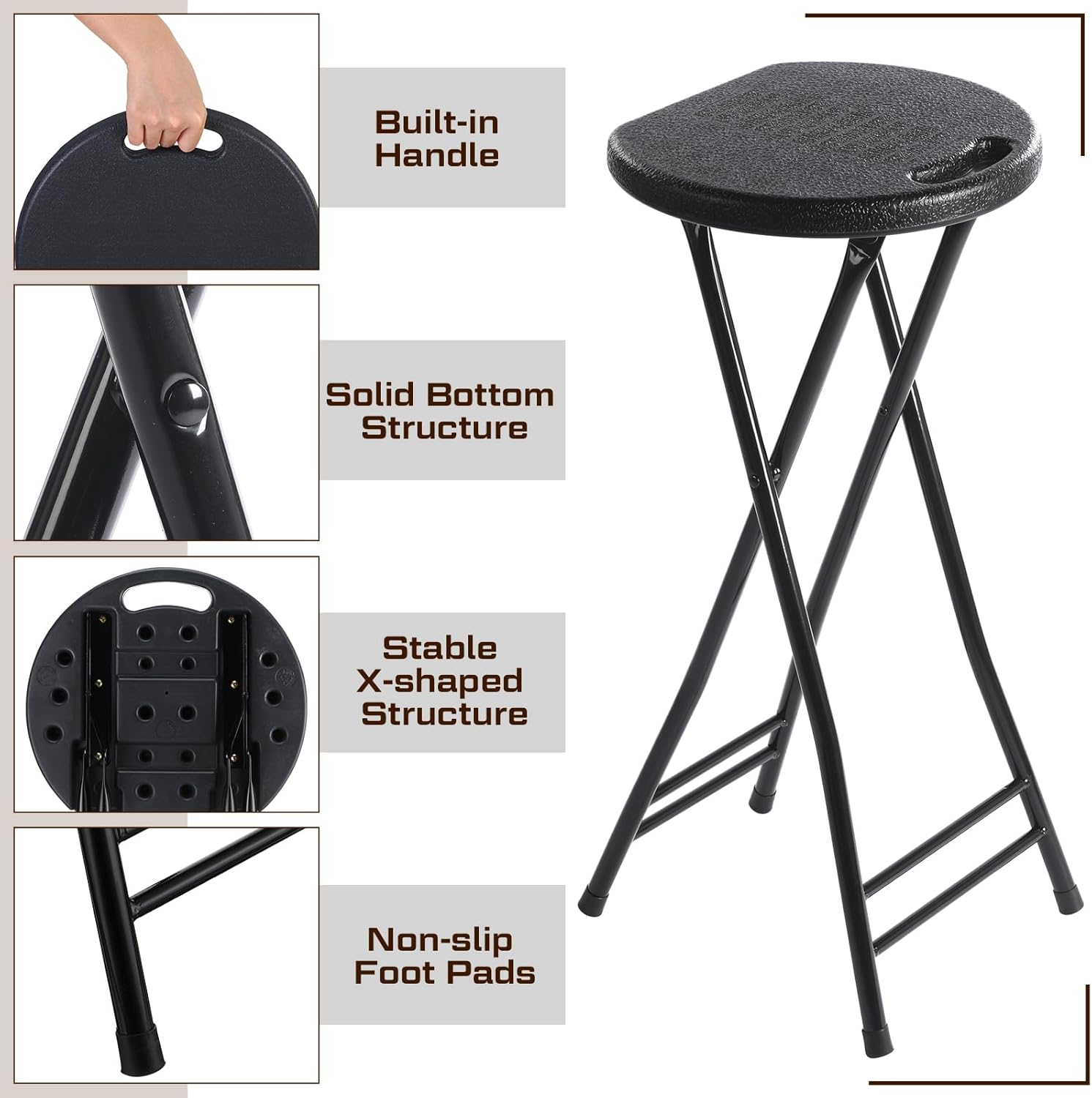 • Stable Design: our portable folding stool adopts parallel bars to enhance the overall stability, equipped with foot covers to prevent slippage while protecting the floor from scratches, ensures safety, security and comfort for you and your guests