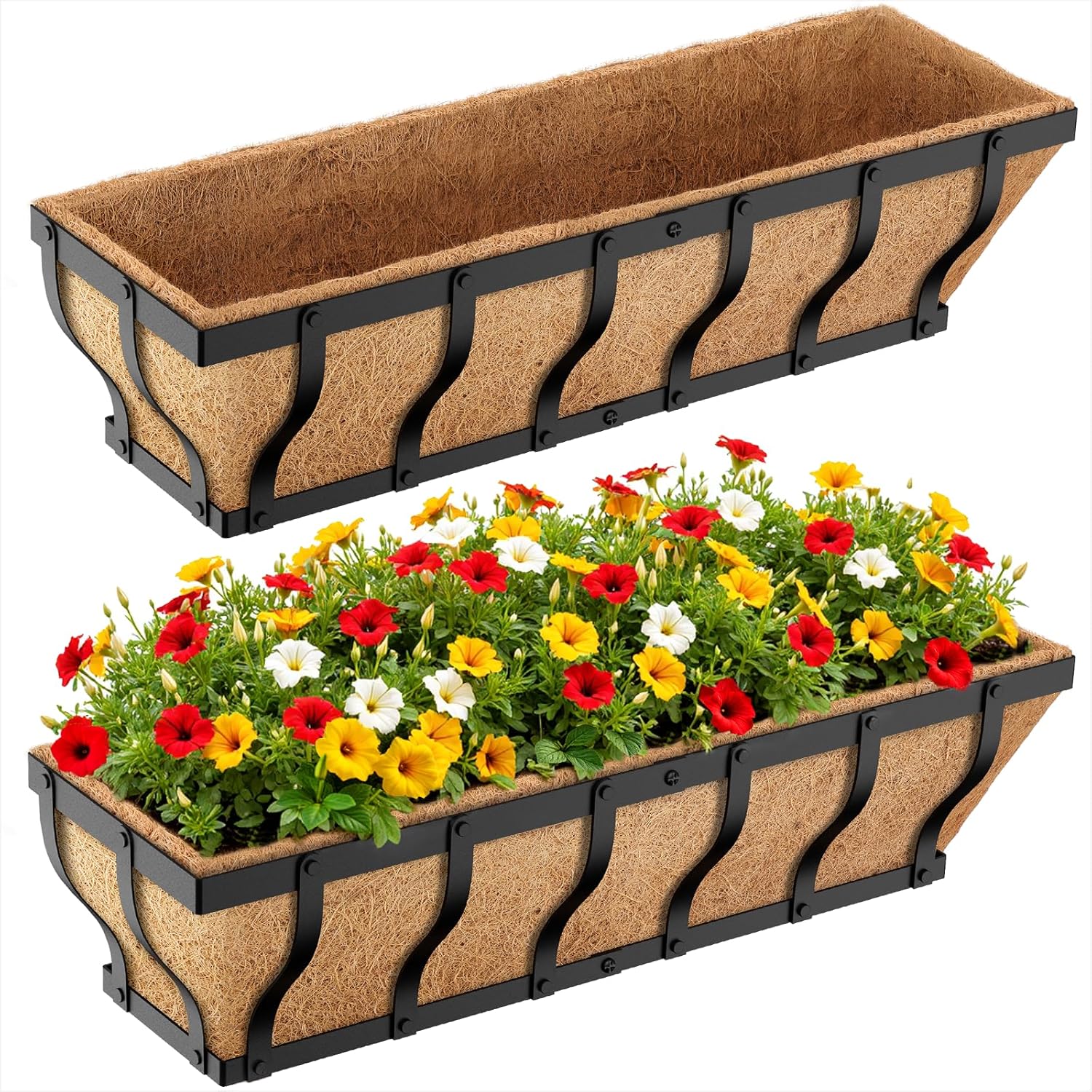 Railing Planter Boxes, Heavy Duty Wall-Mounted Window Box Planters with Coco Liner, Outdoor Window Flower Boxes for Windowsill, Deck, Porch, Balcony, and Patio Gardening (2 Pack, 24 Inch)