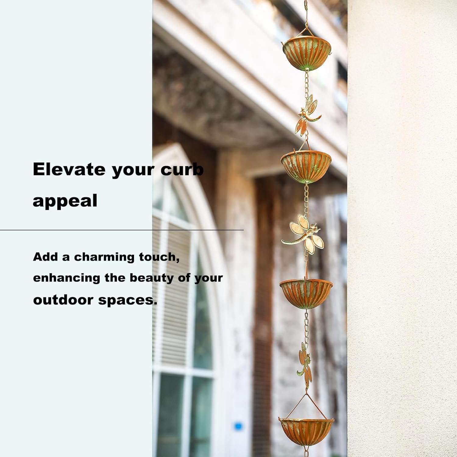 • Efficient Rainwater Management: This 8.5 feet length rain chain includes a hanger and features 9 wide bowl mouths to efficiently capture most of the rainwater, with 8 cute dragonflies attached to the chain