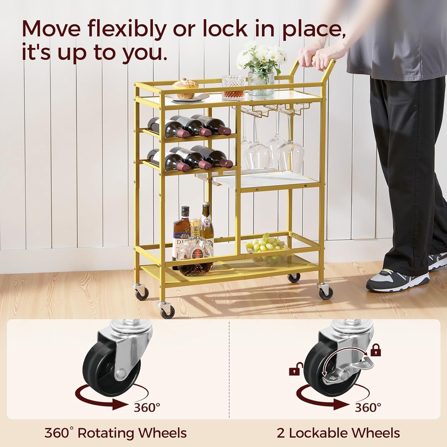 • Flexible Swivel Casters: Equipped with four 360° swivel casters, two of which are lockable, this bar cart for home glides effortlessly to any location or stays firmly in place when needed, offering both convenience and stability