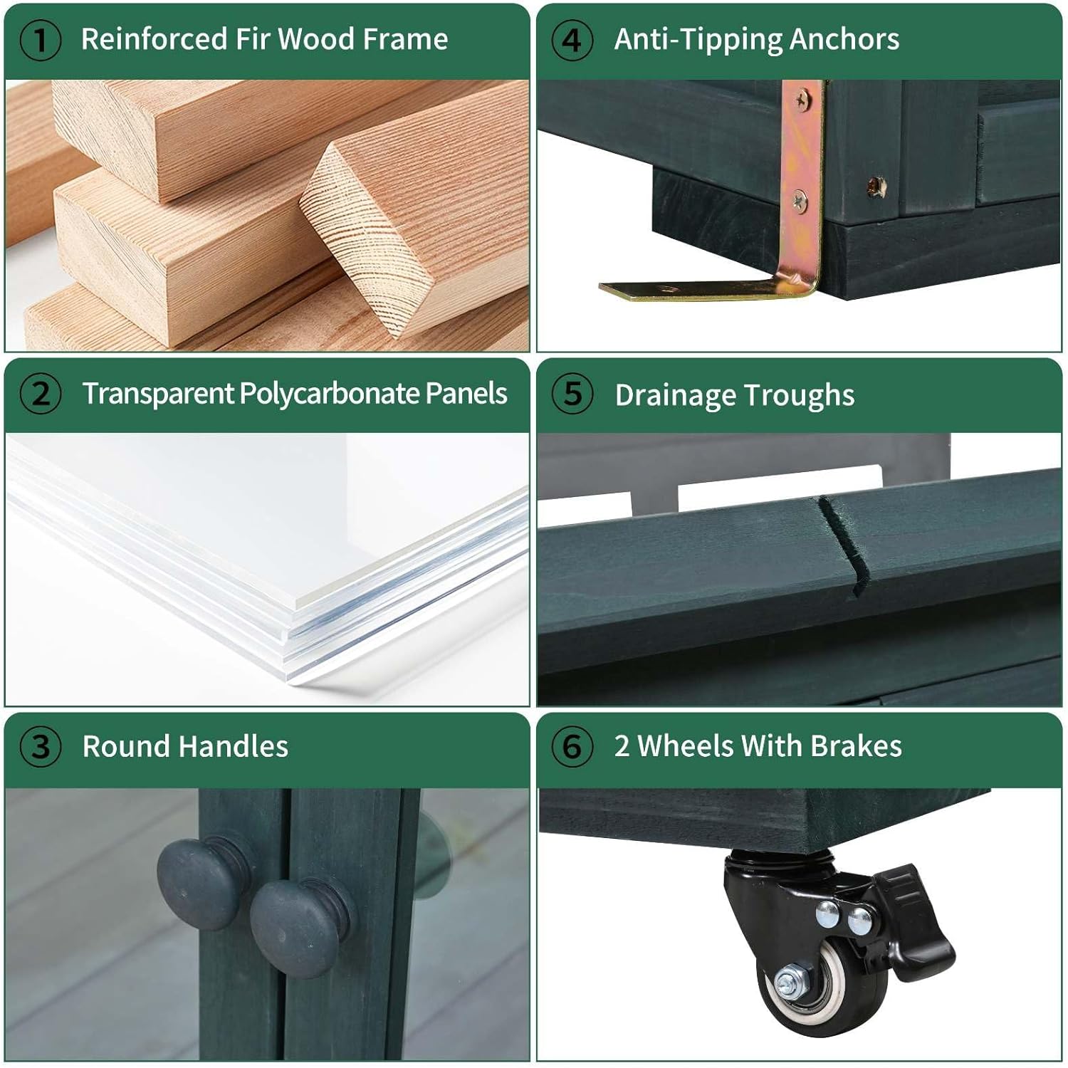 • STURDY FIR WOOD & POLYCARBONATE CONSTRUCTION: Our greenhouse combines natural fir wood frame with transparent polycarbonate panels that diffuse sunlight evenly, creating an ideal growing environment while protecting plants from harsh weather conditions, extending your growing season