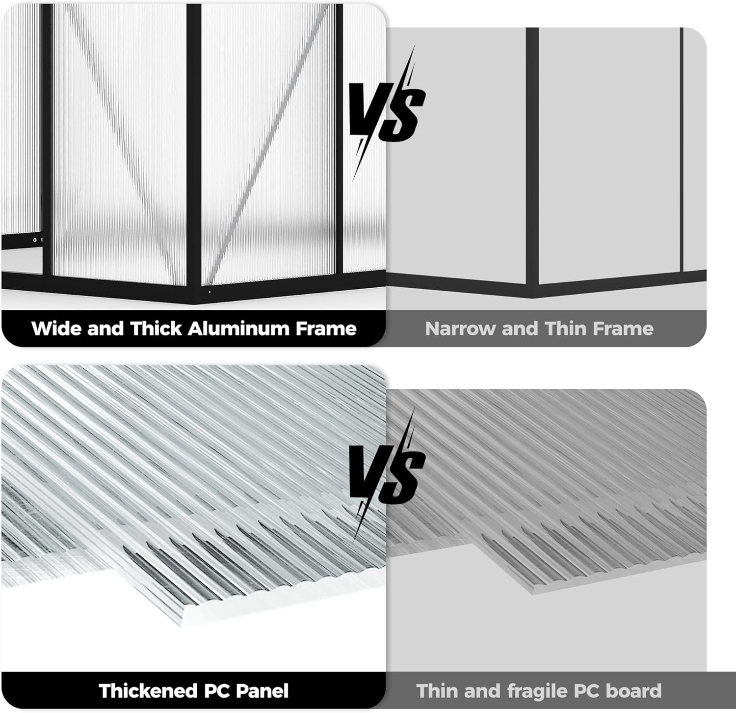 • 【Durable structure】The walk-in greenhouse is made of high-quality polycarbonate and reinforced aluminum frames, they offer robust protection against wind, rain, and snow. To increase stability, anchor the footing in soil or concrete. The reinforced side walls and base have improved their resistance to wind and snow. For your convenience and security, it comes equipped with a robust metal handle and a lockable door