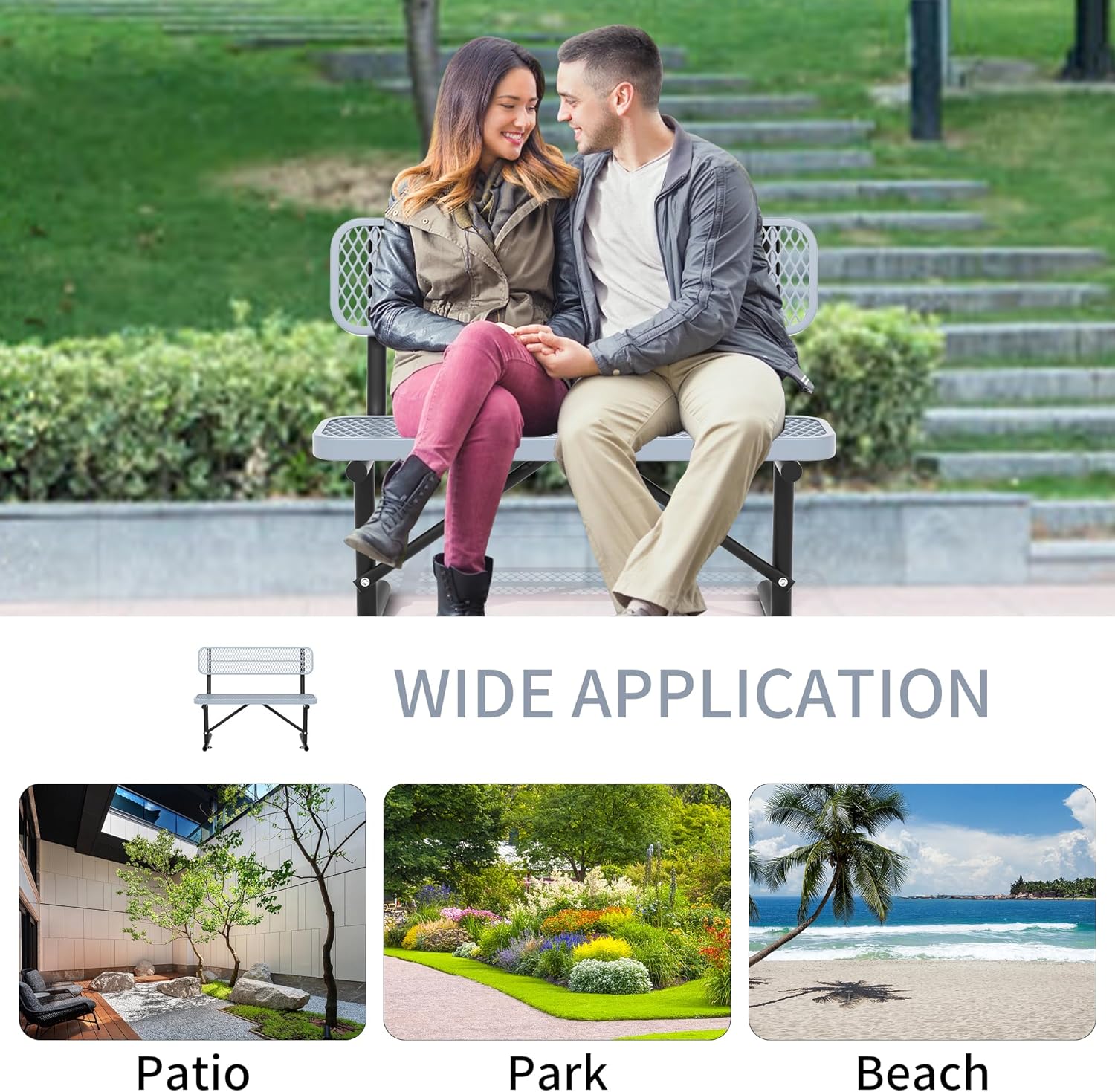 • Outdoor Park Bench: This portable outdoor bench is made of high-strength steel with an all-weather thermoplastic coating on the surface, super smooth, rust-proof & waterproof. It is suitable for various outdoor or indoor places, such as camp fields, park, courtyards, backyards, gardens, pool sides, and living rooms.
