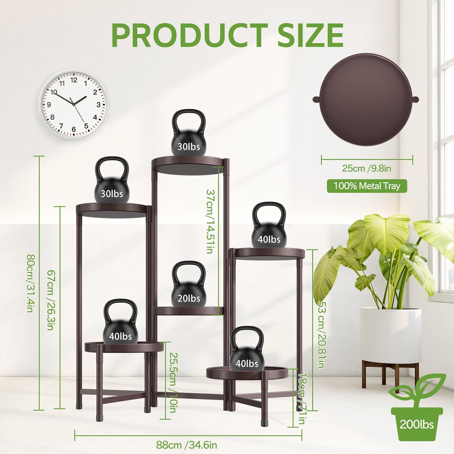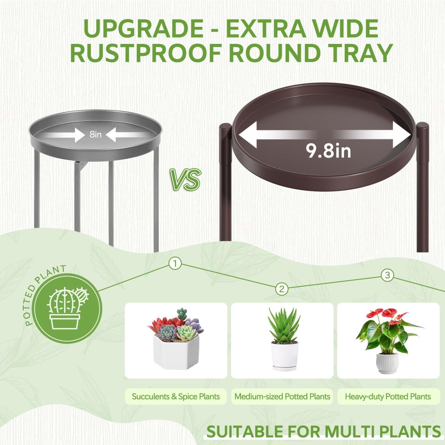 • 9.8 In Extra Wide Round Tray: This corner plant stands for indoor plants has been upgraded with an enlarged 9.8-inch diameter metal round tray with a total weight capacity of 156 lbs for large & heavy duty potted plants. The tiered plant stand is made of sturdy and durable iron with a waterproof and rustproof golden lacquer finish, making it suitable for indoor and outdoor use