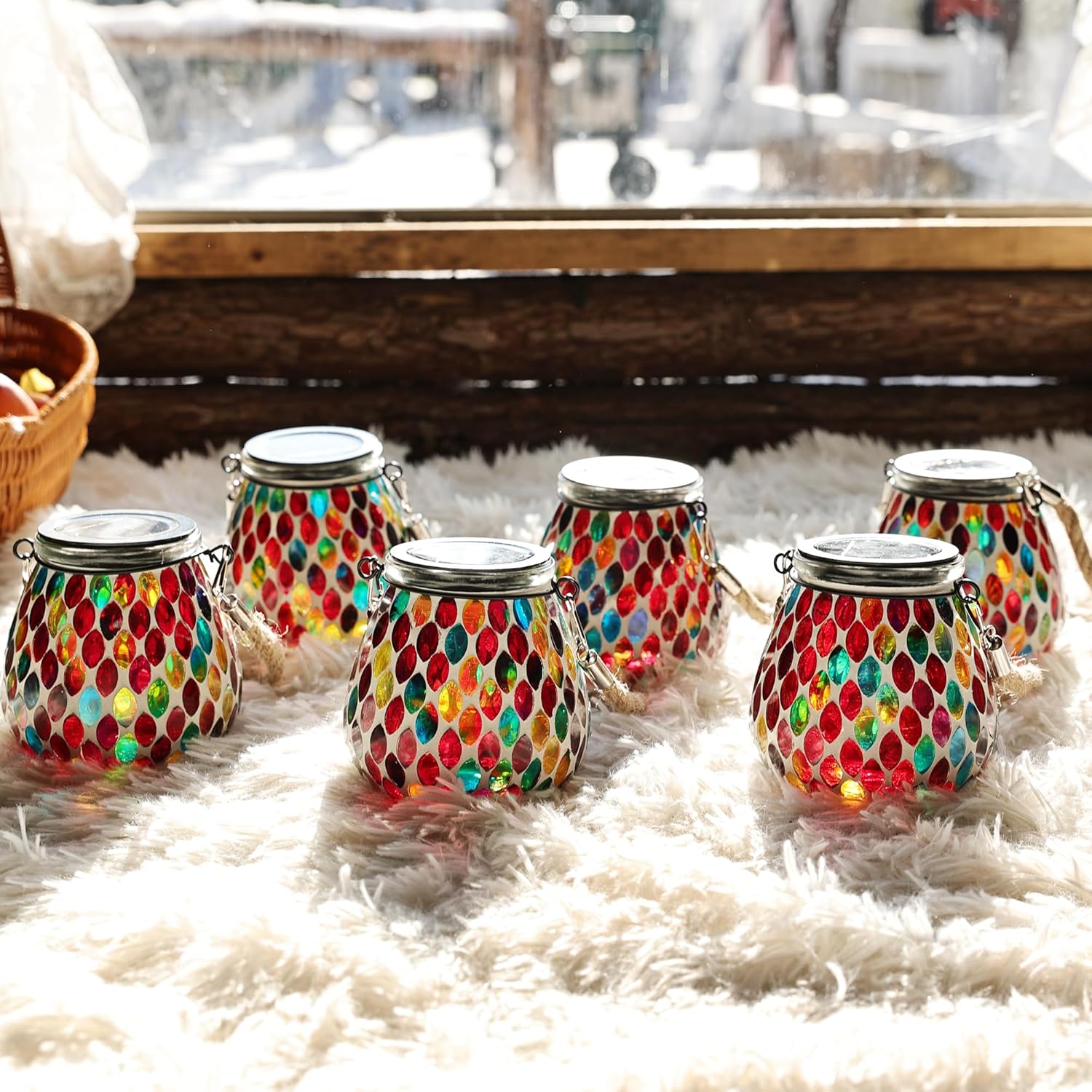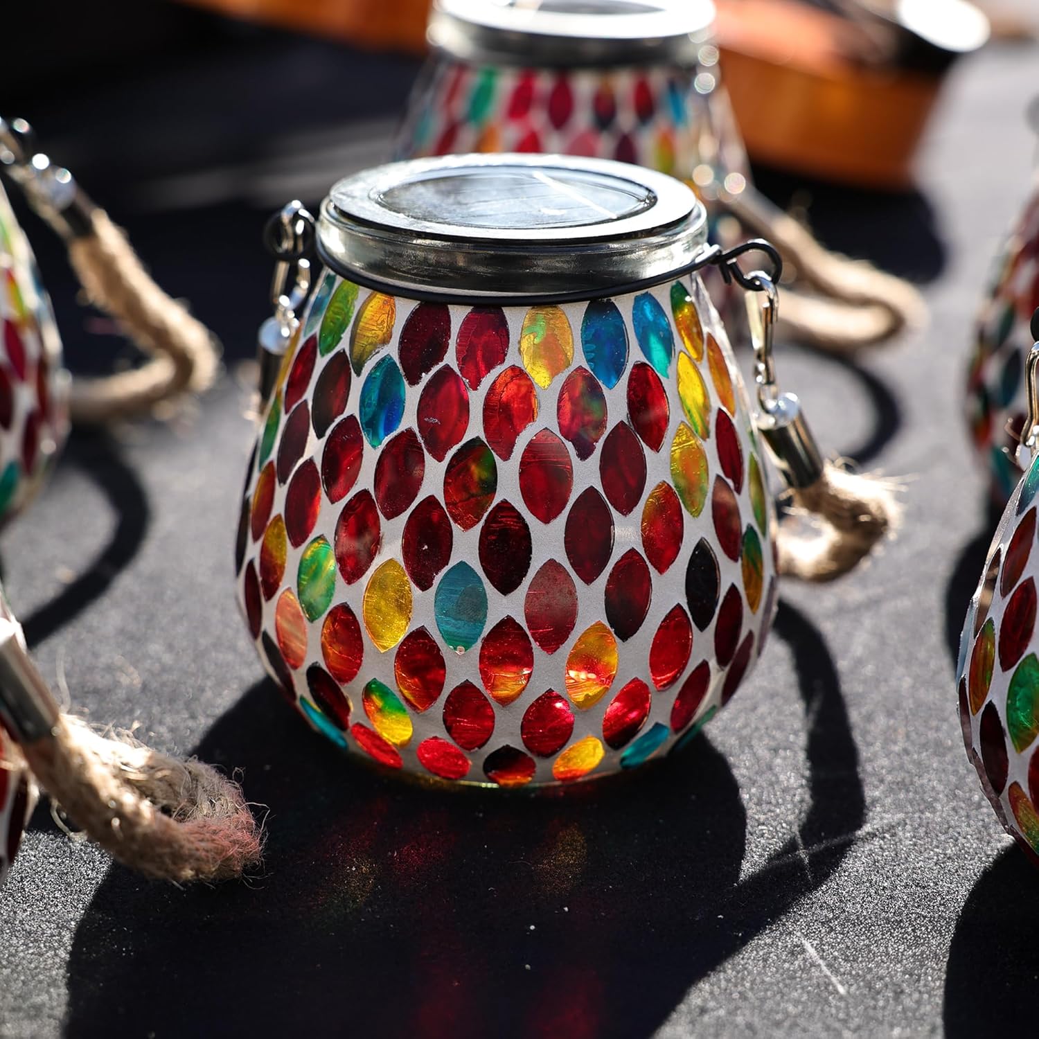 Cooo 2 Pack Mosaic Solar Lantern Outdoor Waterproof IP68 Hanging Projection Light Hidden Lid Pear-Shaped Lantern with Rope Handle Solar Powered Auto On for Patio Garden Fence Table - Crimson Ember