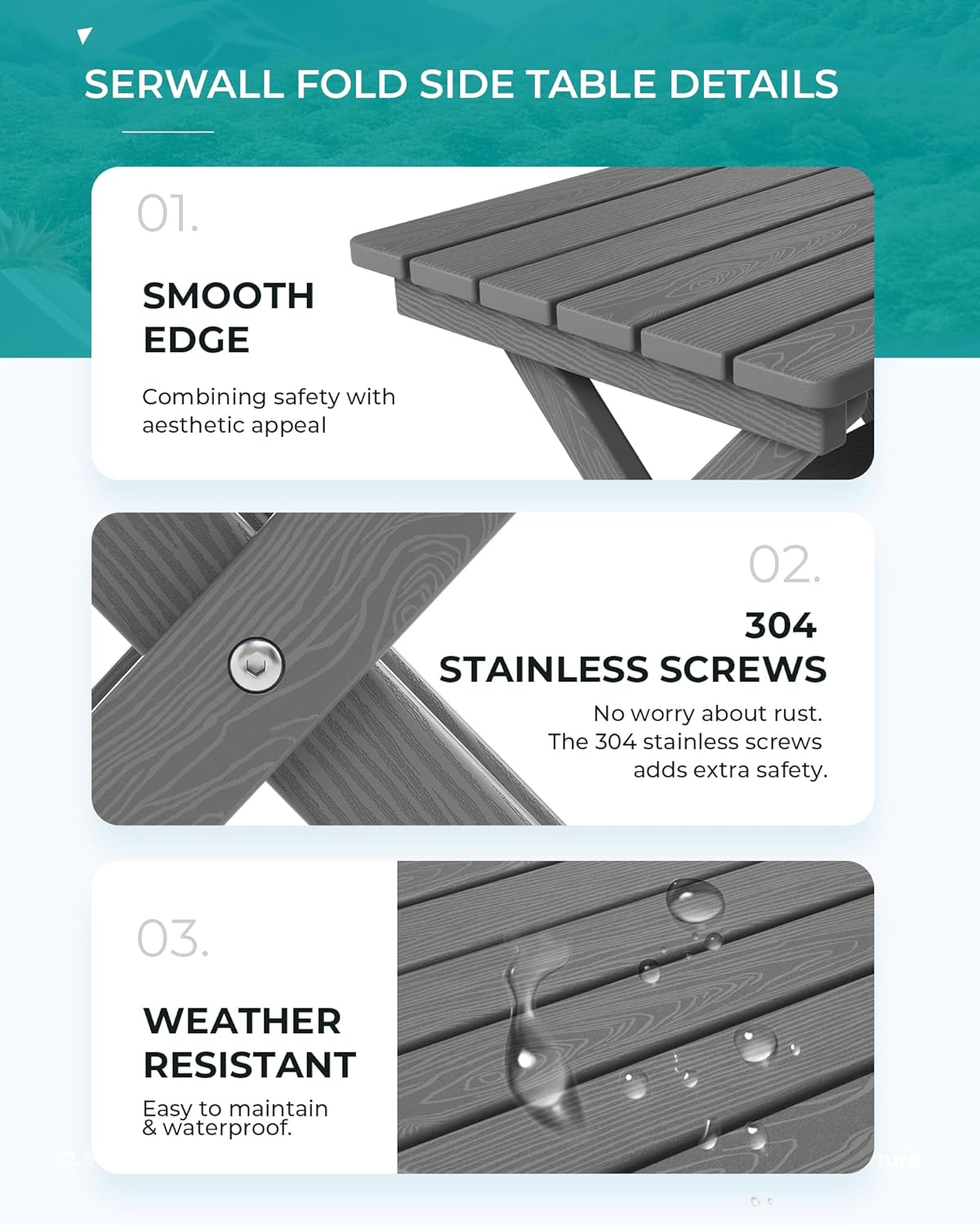 • [Foldable Outdoor Side Table] The SERWALL Adirondack Side Table features a foldable design that significantly reduces its footprint when folded, providing an optimal space-saving solution for outdoor enthusiasts.