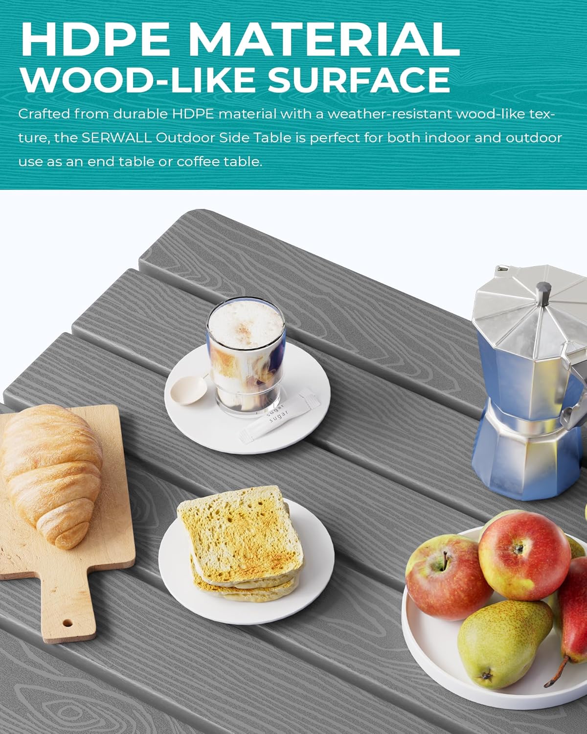 • [Premium Wood-Textured Surface] Offering the aesthetic appeal of wood without the upkeep, the SERWALL Side Table features a wood-textured HDPE surface that adds an elegant and natural touch to your outdoor decor.