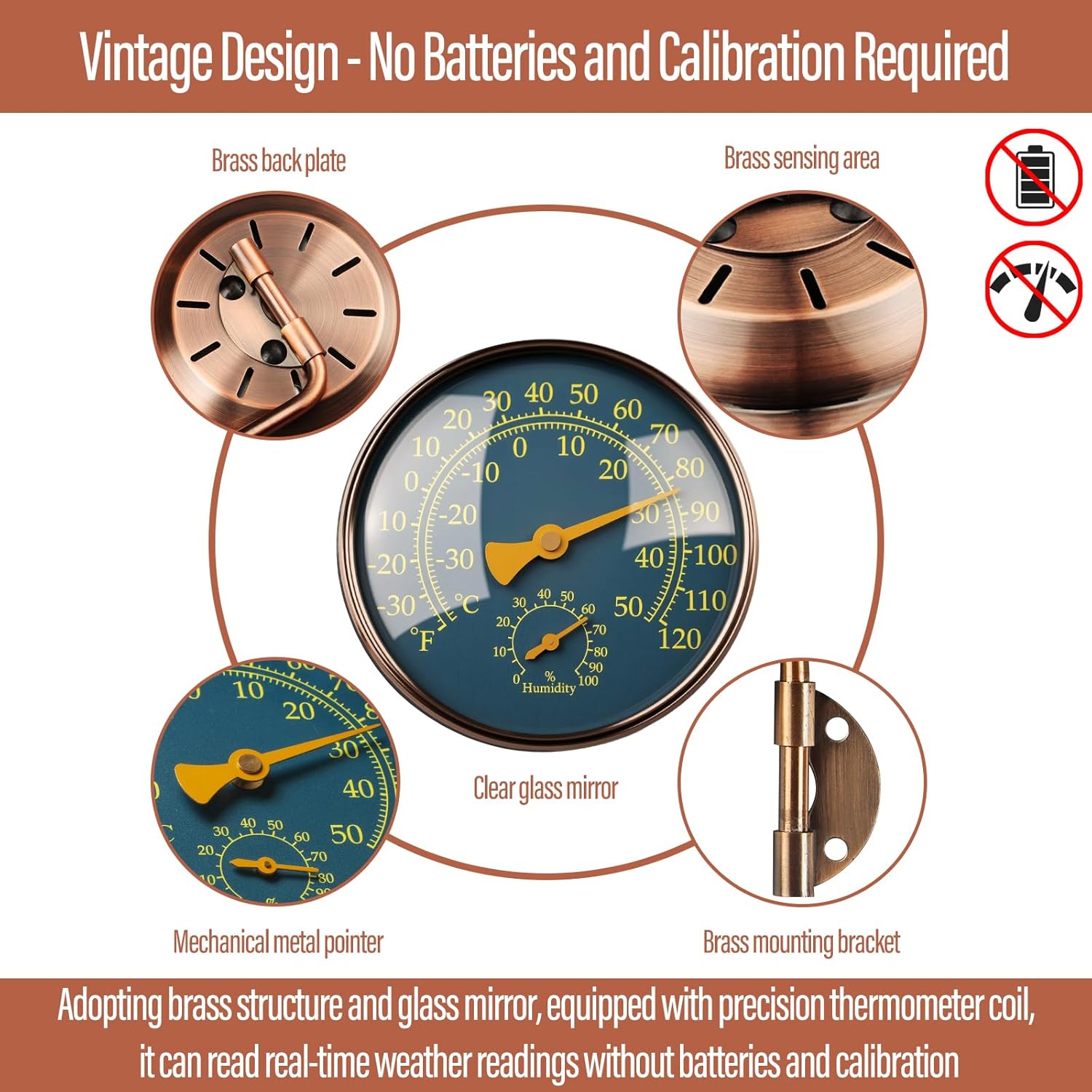 • Vintage Design: Adopting brass structure and glass mirror, equipped with precision thermometer coil, it can read real-time weather readings without no batteries required and calibration