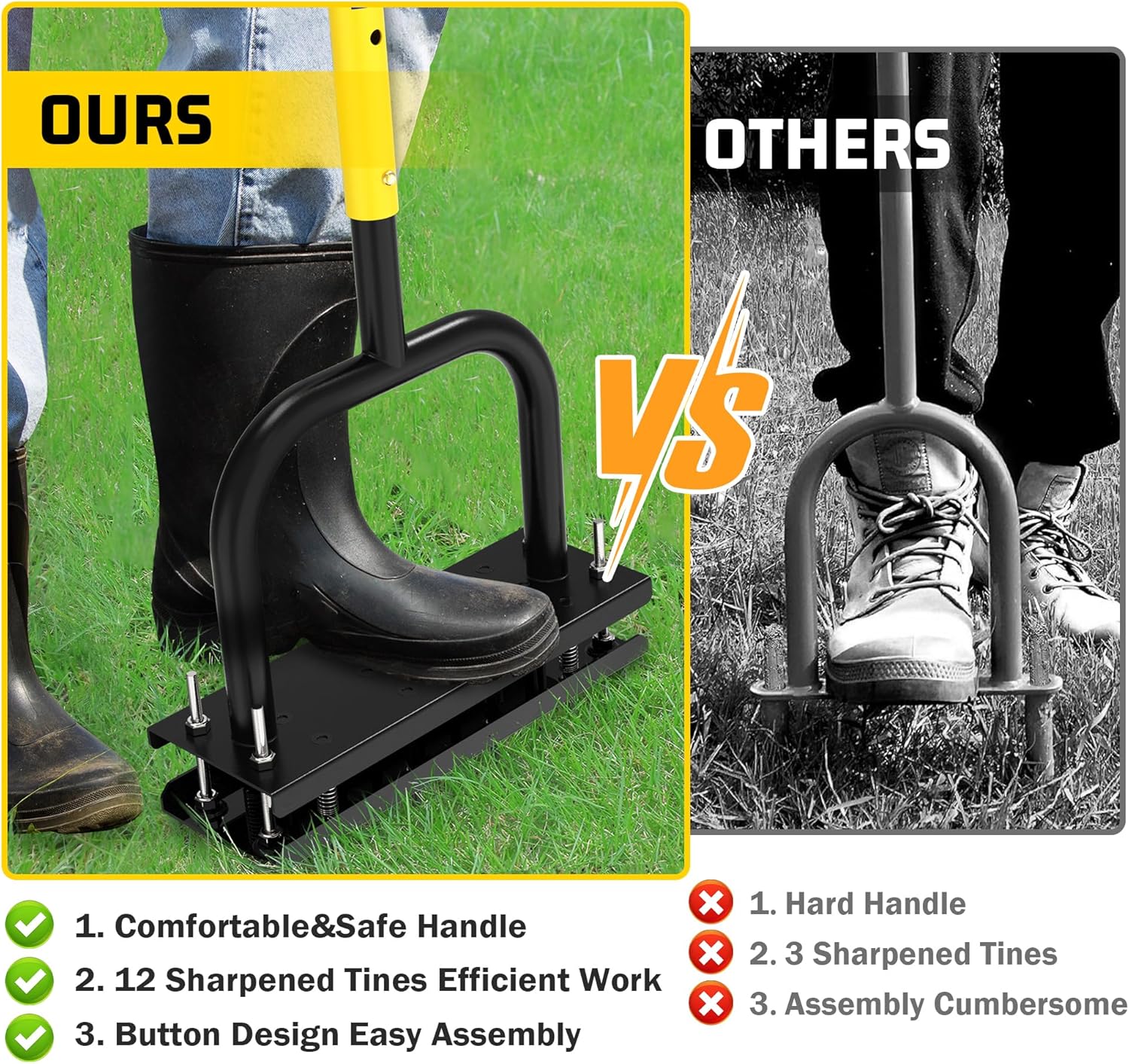 • 【Efficient Manual Lawn Aerator】The lawn aerator penetrates the soil with iron spikes so that it can be easily inserted into the ground, loosening the soil, effectively solving soil problems, improving drainage and air circulation, allowing water, oxygen and nutrients to easily reach the roots of the plants, and helping the planted plants and grass seeds to breathe and grow better