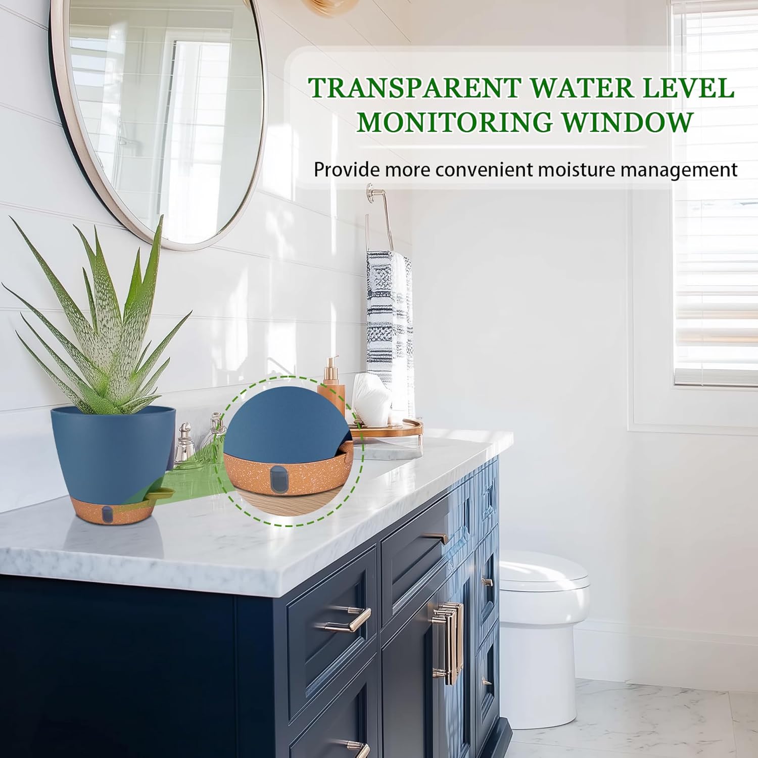 2 Pack 8 inch Plant Pots, Plastic Self Watering Planters with Drainage Holes, Deep Reservoir, Water Level Indicator, Modern Decorative Flower Pots for Indoor Outdoor Plants (Navy Blue, 8 inch)