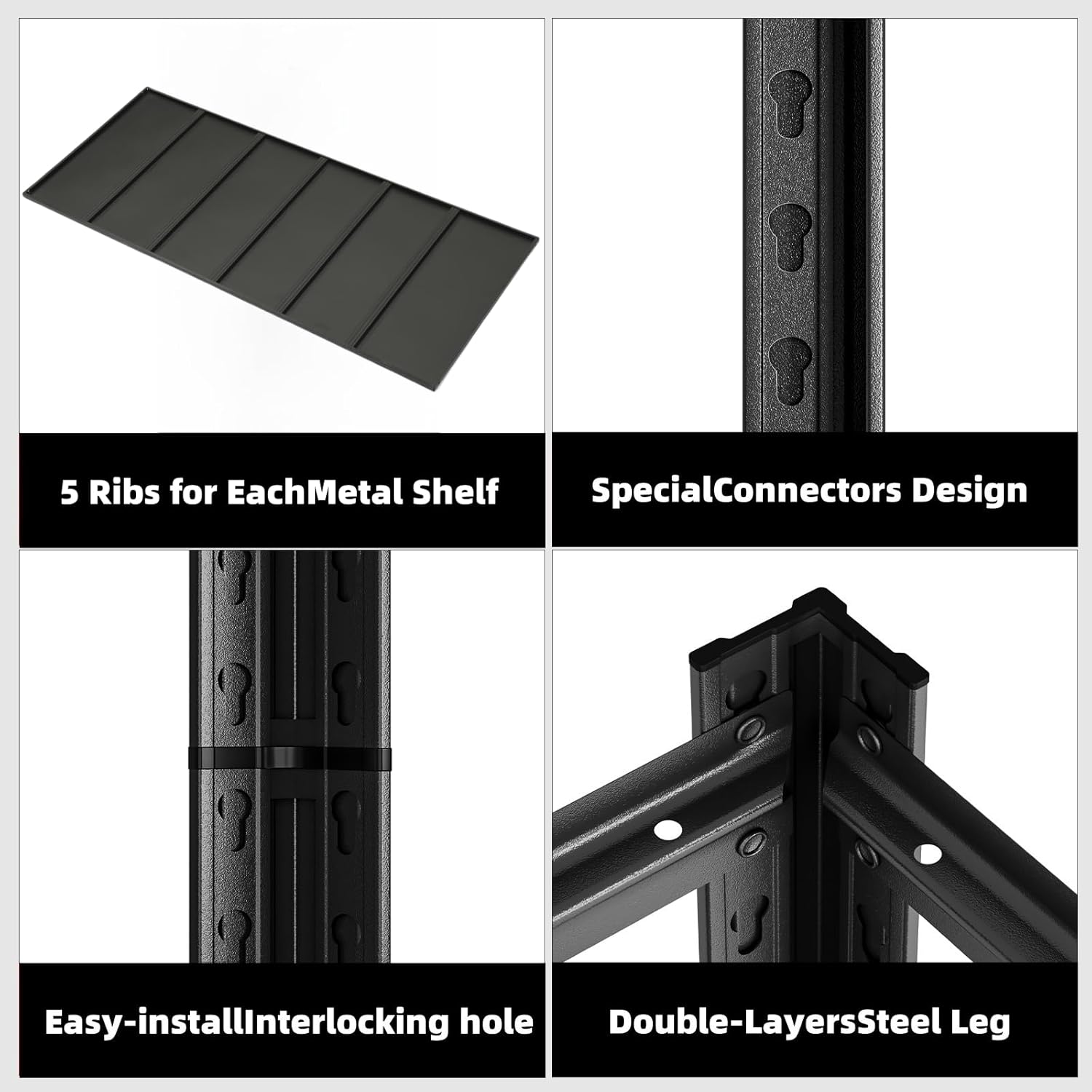 • 5 Tier Metal Shelf Unit: The garage shelves are constructed with reinforced, double-layered uprights that deliver exceptional load-bearing capacity, ensuring long-term use and stability. Each shelf incorporates 5 reinforcing rods and 1 support ribs at the back, enhancing stability and ensuring even weight distribution for the safe storage of heavy items.