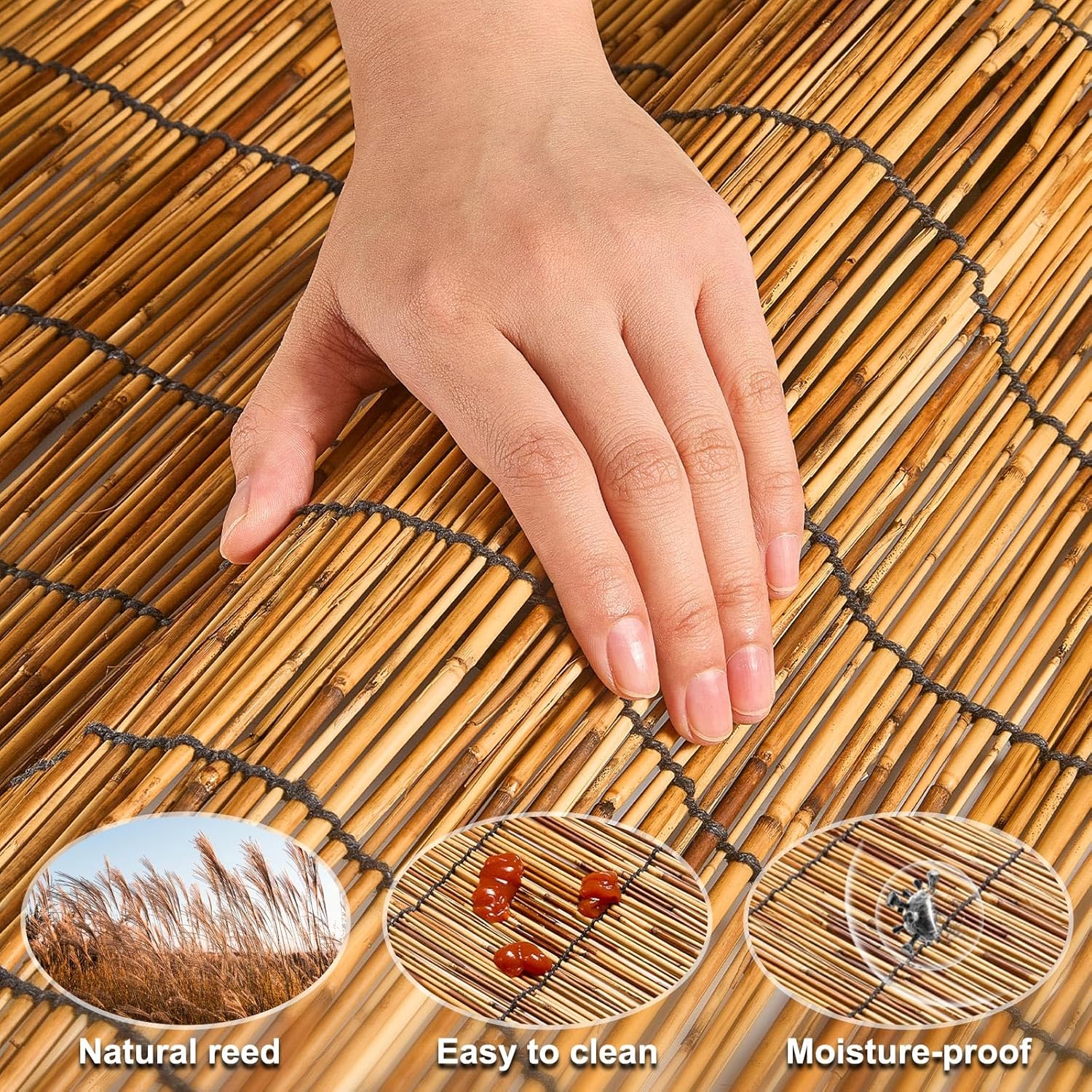 • Pure Natural Reeds:Our premium reed screen are all hand made,using the high quality reed from the monsoon climate of medium latitudes,these reed fencing are made from carbonized reeds,which are stronger and safer than plastic reeds,Each one is clean, strong and straight,The reed fence are naturally water resistant and will last for years.