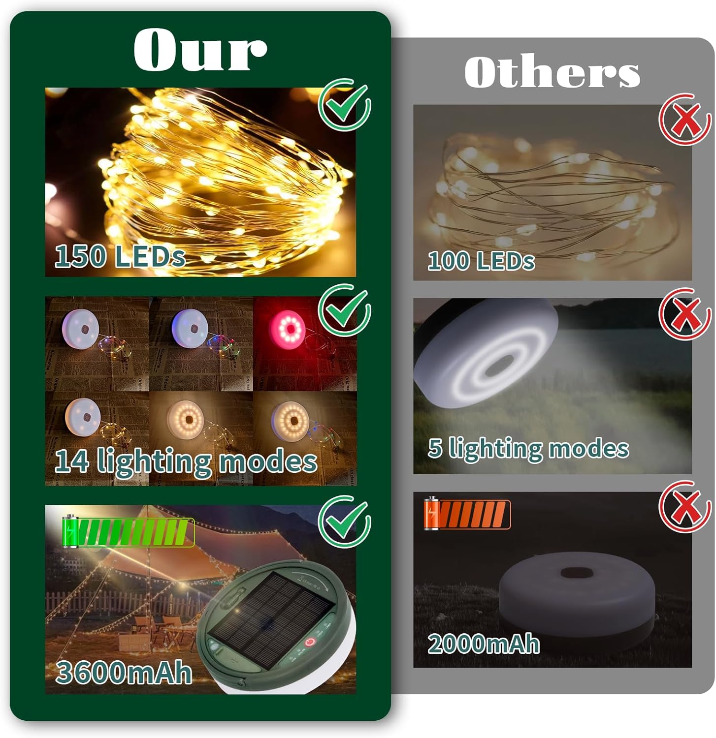 • 180 LEDs for Ultimate Illumination: Camping Lights With 150 dense fairy LEDs on a 32.8-foot string LED spacing is 1.9 inches and 30 brighter LEDs in the camping lamp , these solar camping lights provide a wide lighting area and a magical atmosphere. They are perfect camping essentials for lighting up your campsite, tent, RV, or trailer, and are equally ideal for parties and holiday decorations.