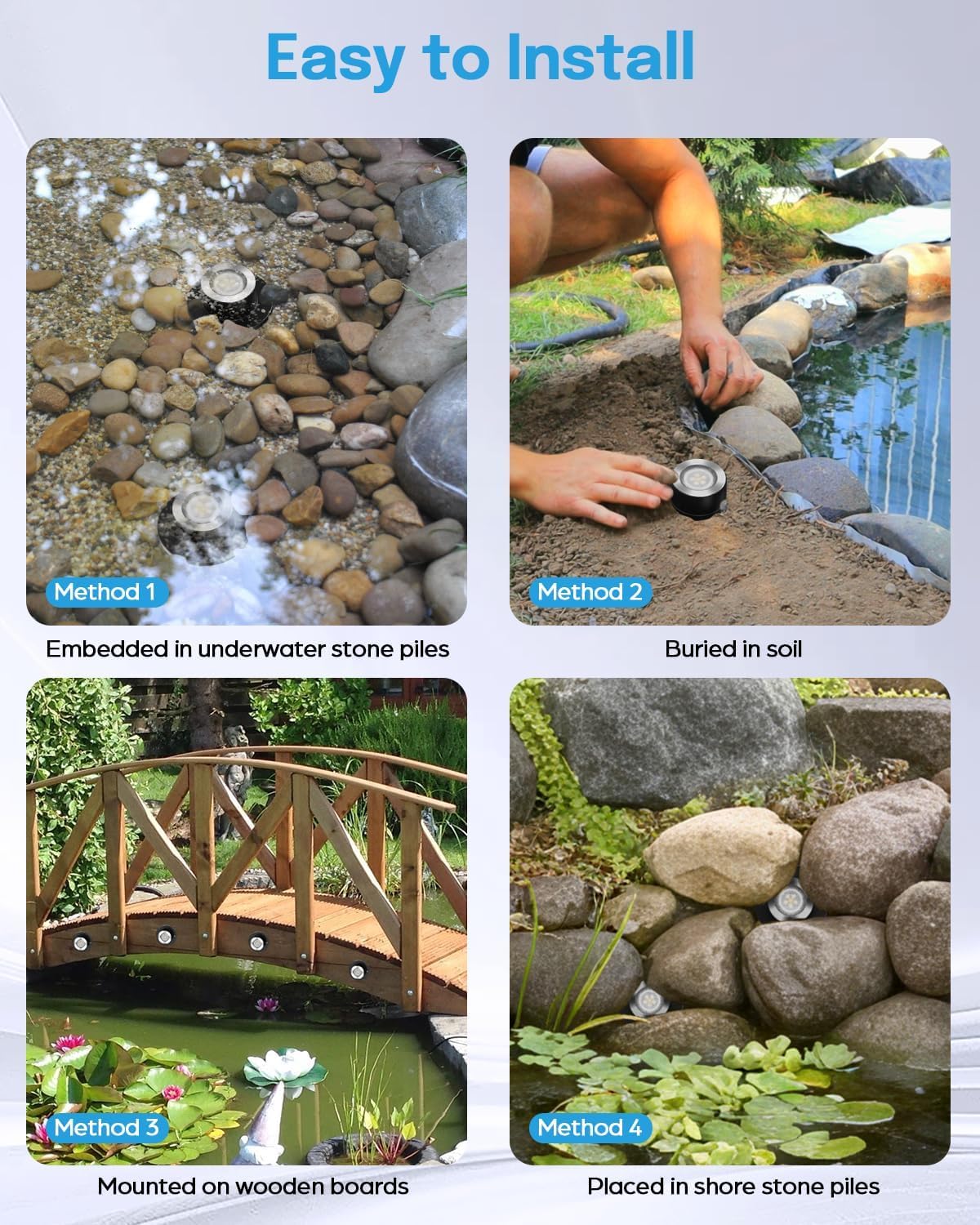 • WIDELY APPLICABLE - Fountain Lights Underwater Outdoor LED are powered by a 12V AC/DC power supply and are compatible with virtually any low voltage lighting system used for outdoor landscape lighting. Underwater lights can be widely used in pool waterfalls, outdoor ponds, fountains, streams, water statues, creeks, pond rocks, etc. We promise 12-month replacement warranty and lifetime after-sale support guarantee. buy with confidence.