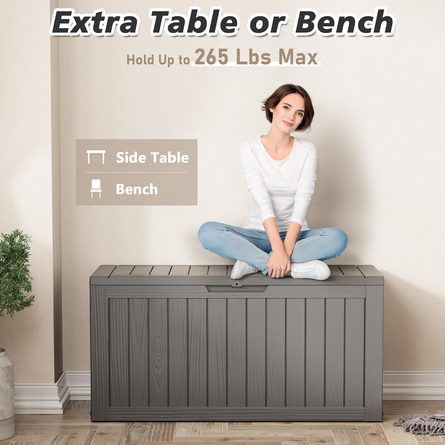 • Deck Boxes Outdoor Waterproof: Designed as a waterproof storage solution, this deck box protects your belongings from moisture and ensures they stay dry even during heavy rain. The lockable lid adds an extra layer of security, keeping your valuables safe from theft or damage.