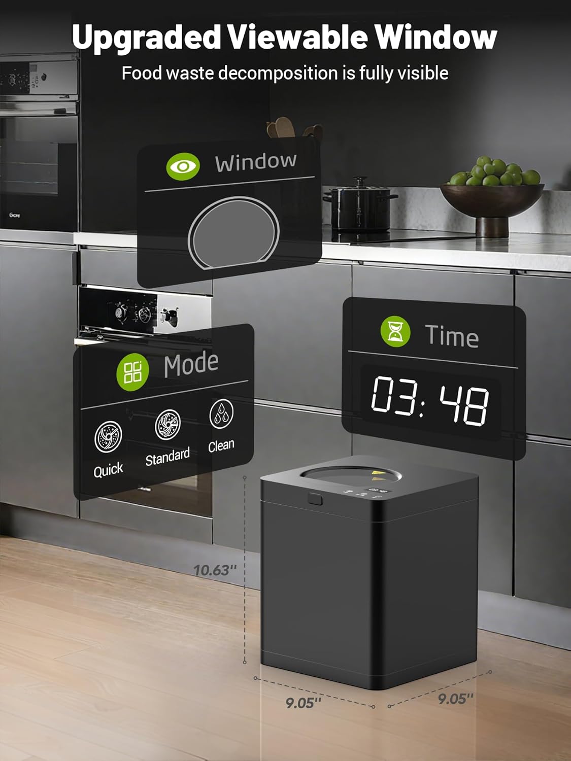• Smart & User-friendly Design: Our kitchen composter featuring a intuitive LED display, ensures easy operation for all ages. With one-touch auto-clean function, say goodbye to manual scrubbing, save time and effort. The transparent viewing window lets you monitor progress and enjoy the fascinating transformation of waste into compost - like a mini science show in your kitchen!