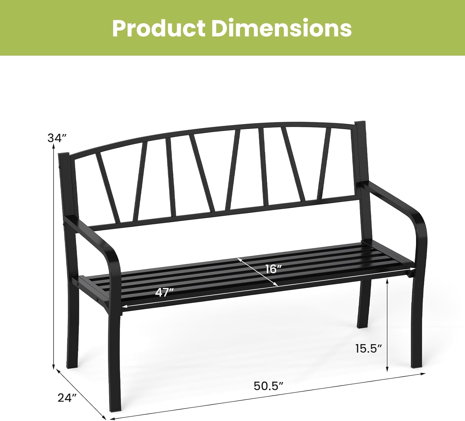 • Versatile Outdoor Use: Ideal for various outdoor environments, this stylish metal garden bench is perfect for enhancing your garden, patio, or poolside area with both comfort and elegance. Overall dimension: 24" x 50.5" x 34" (L x W x H).