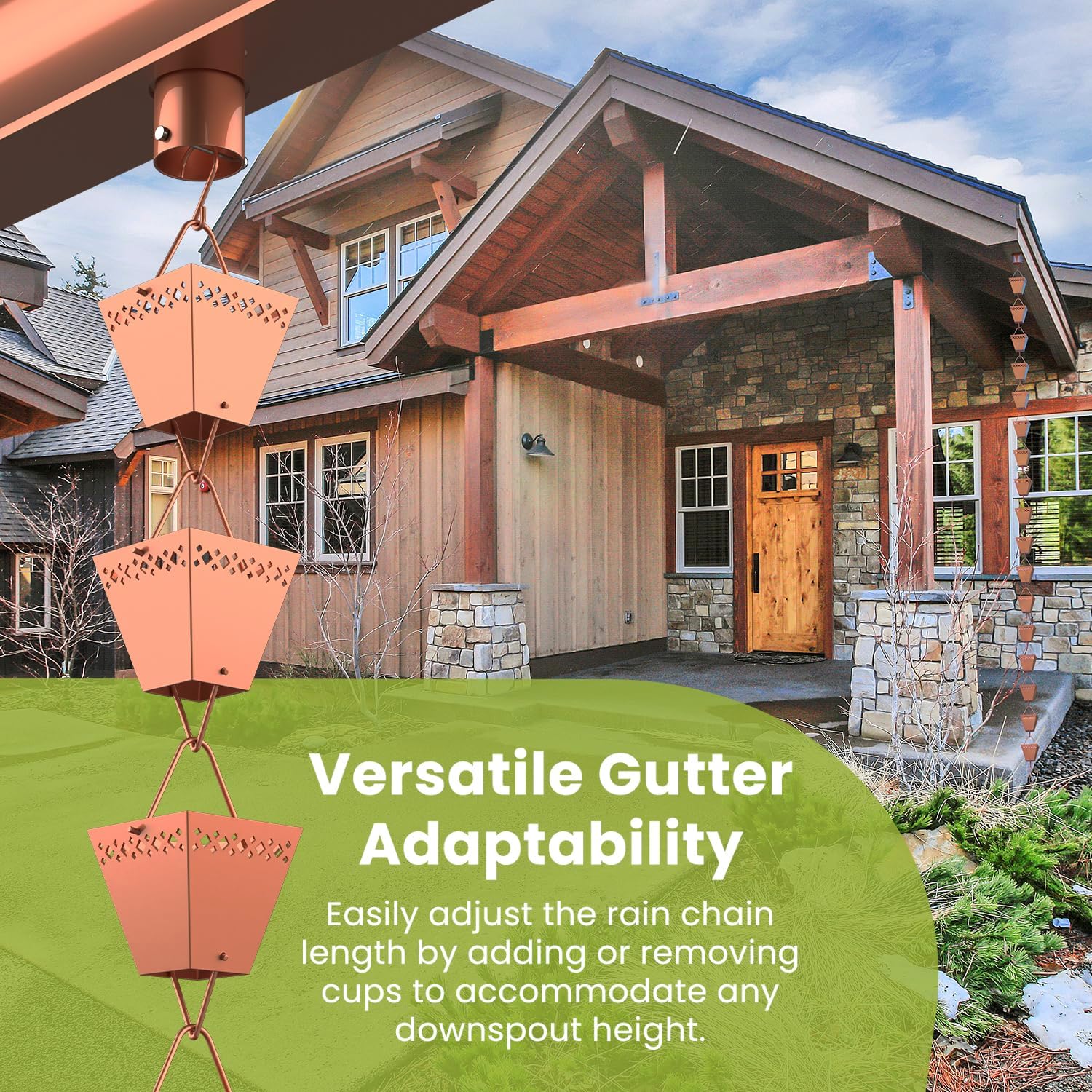 • Adjustable Length: With an adjustable length of up to 10ft, this copper chain rain chime adapts to various gutter heights. The rain chains for gutters for heavy rain design ensures it handles substantial rain flow efficiently and is low maintenance.