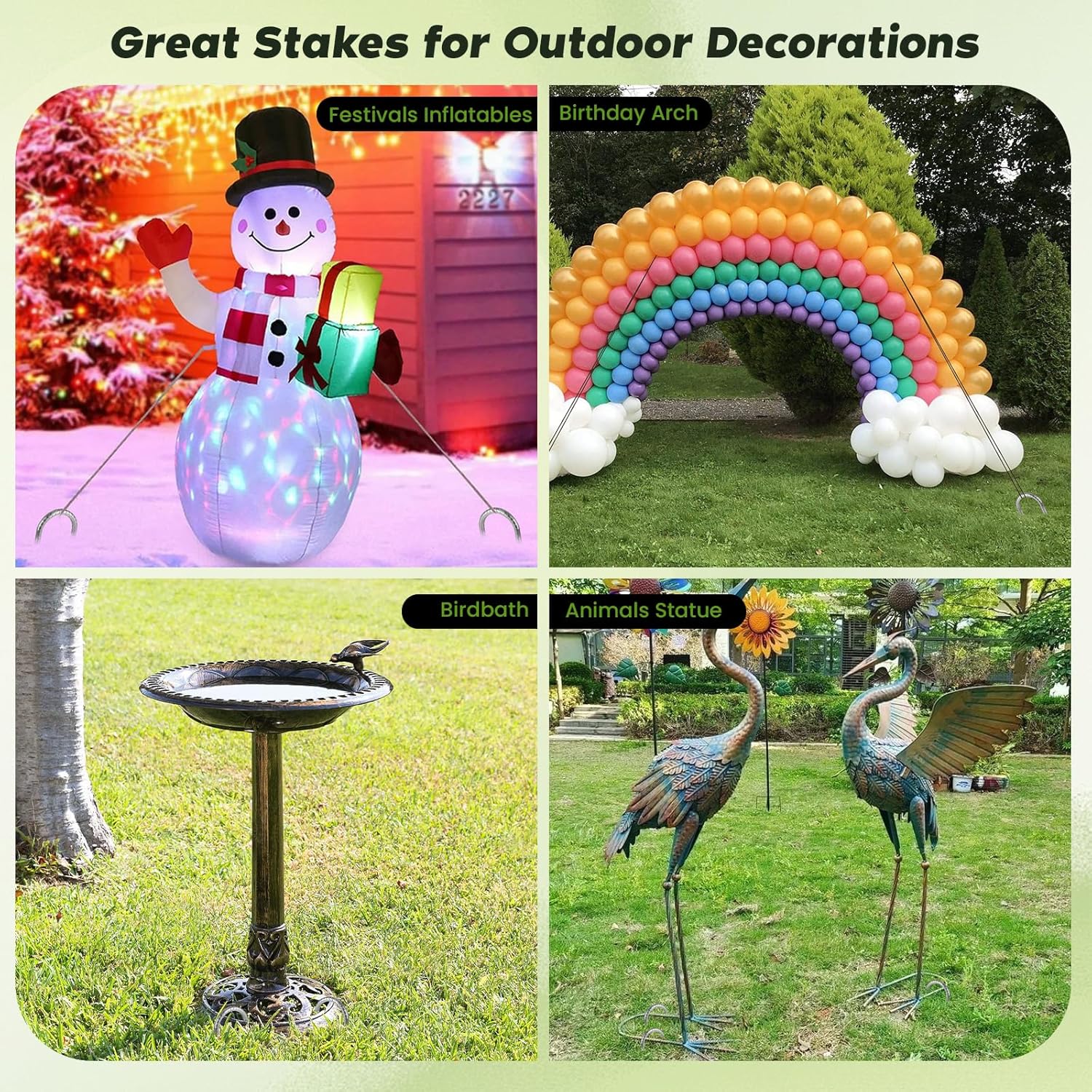 • 【12 inches Stakes Heavy Duty】Sold in bundles of 34 pieces, 12 inches length from tip to hook, 5/16"(8mm) diameter fence stakes. The hook is 2", pefect for holding down inflatables, stake down a tarp, lawn decor, chain link fence etc.