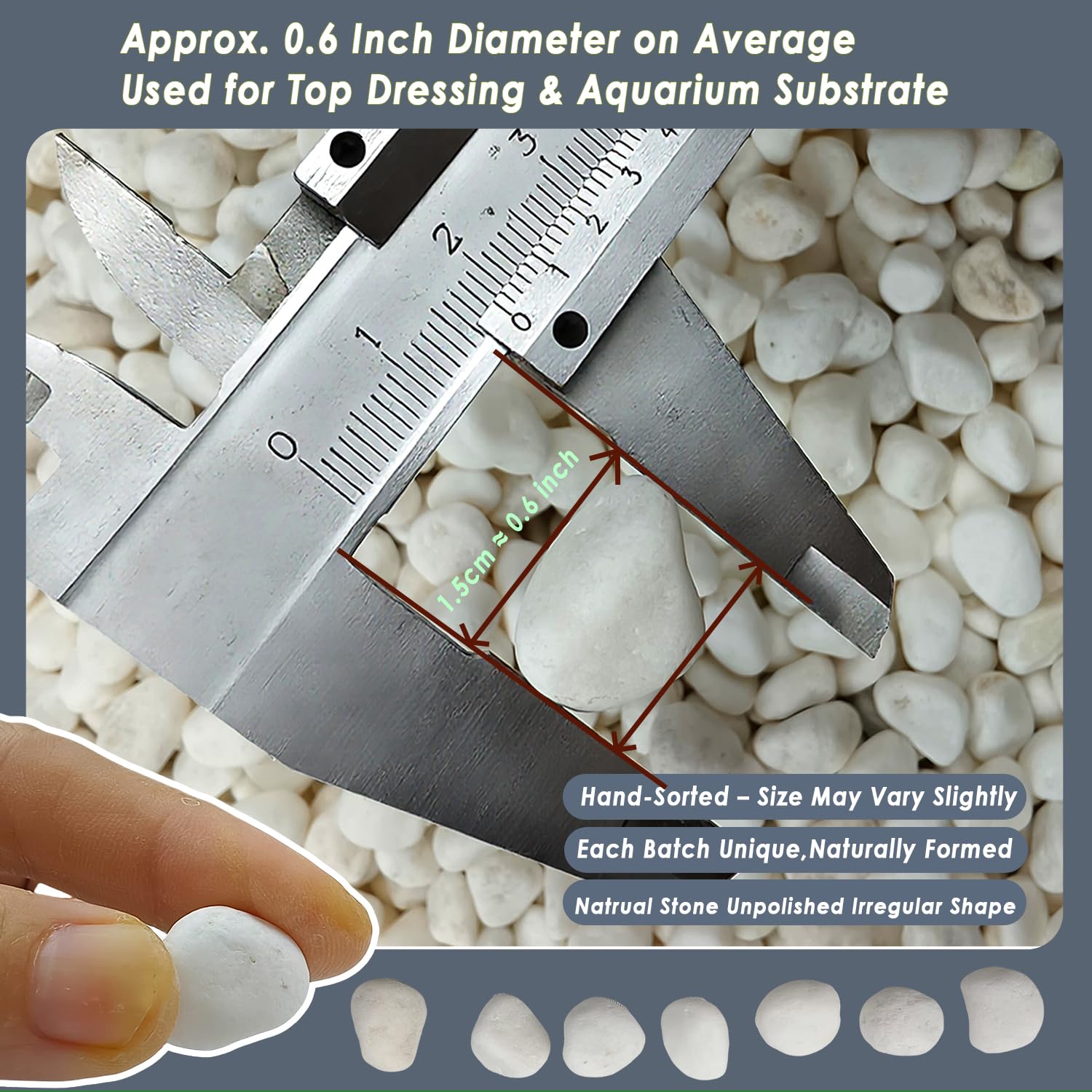 • 【15LB 0.6 Inch Decorative White Gravel for Versatile Use】 Larger 15LB pack of crushed natural white gravel, approx. 0.6 inch in size – suitable for planter top dressing, turtle enclosures, and medium-scale landscaping needs.