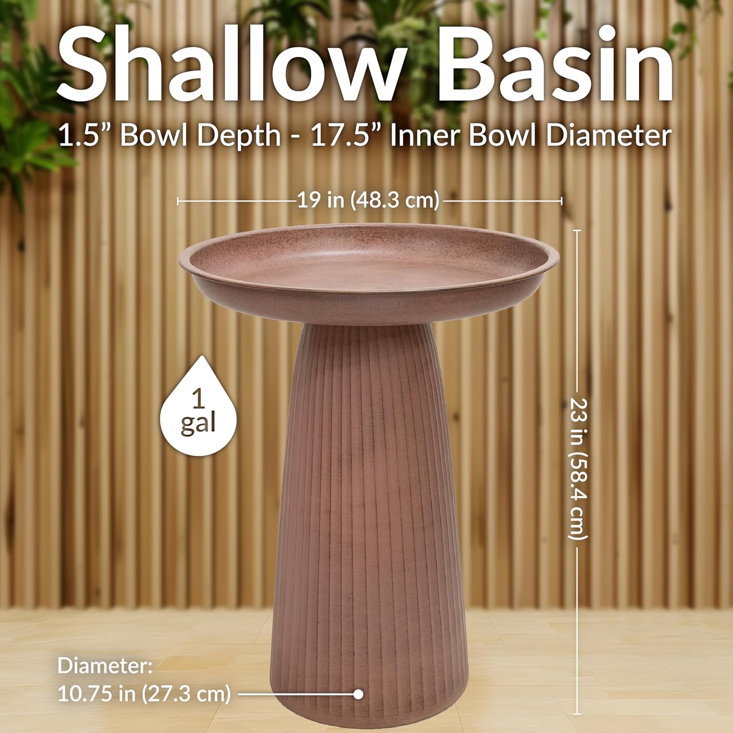 • GREAT SIZE FOR BIRDS: This large bird bath measures 19" diameter x 23" H. The bowl has a 1.5" bowl depth and holds 1 gallon of water. The pedestal has 10.5" diameter base with a hollow 21" inner height. The outdoor bird bath weighs 7.6 lbs for easy placement.