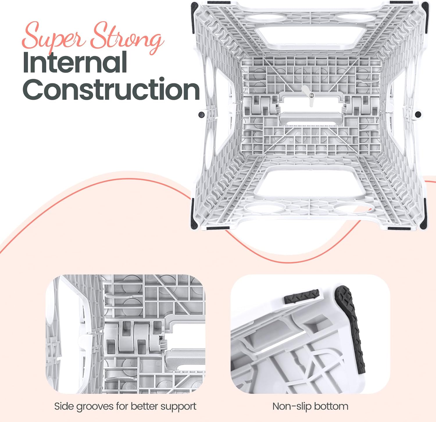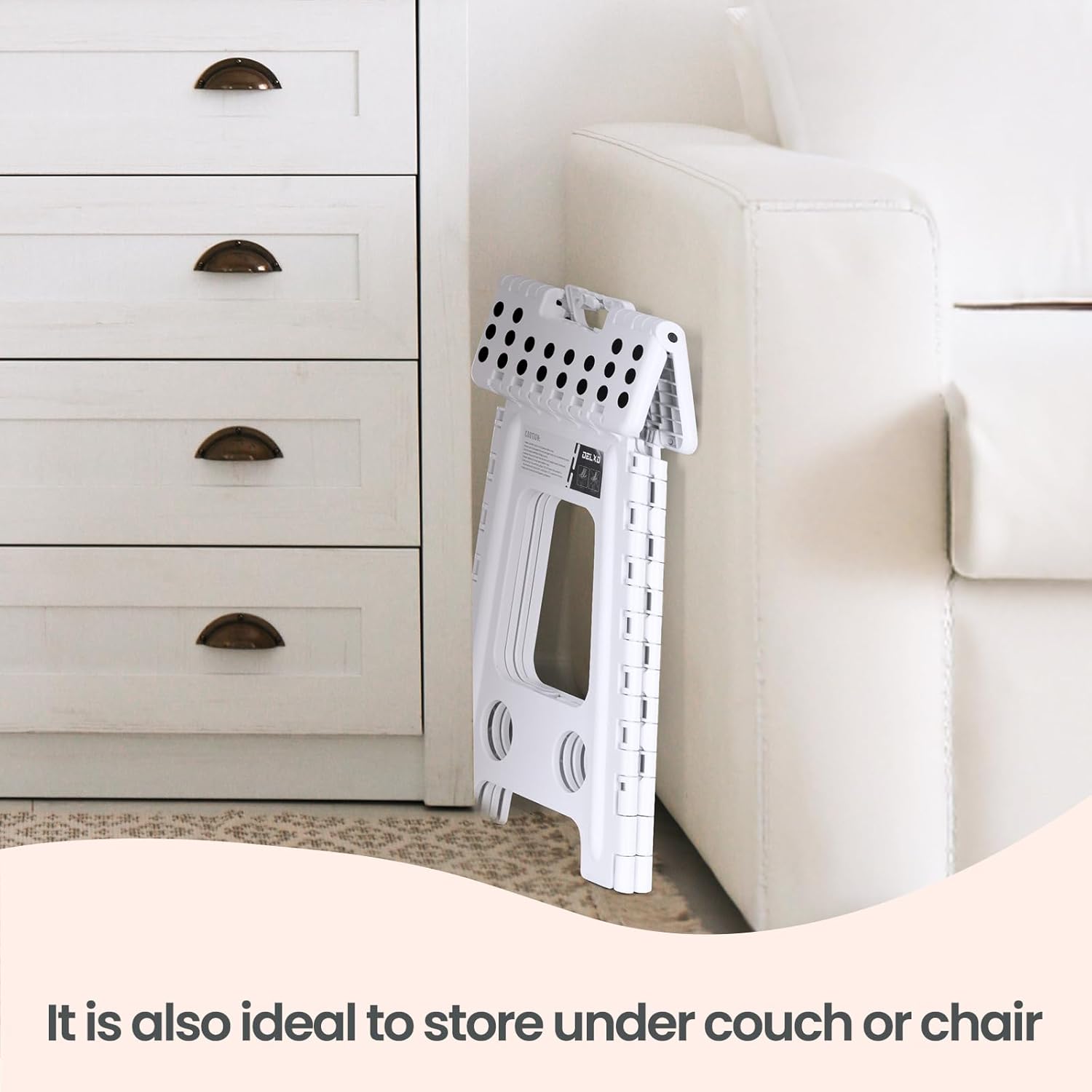 • Space-Saving Folding Stool : Designed to save up to 90% of space when folded, our 16” foldable step stool is easy to store under the bed, in a closet, or in tight spaces between furniture, it also fits perfectly in your car trunk—ideal for small apartments and road trips