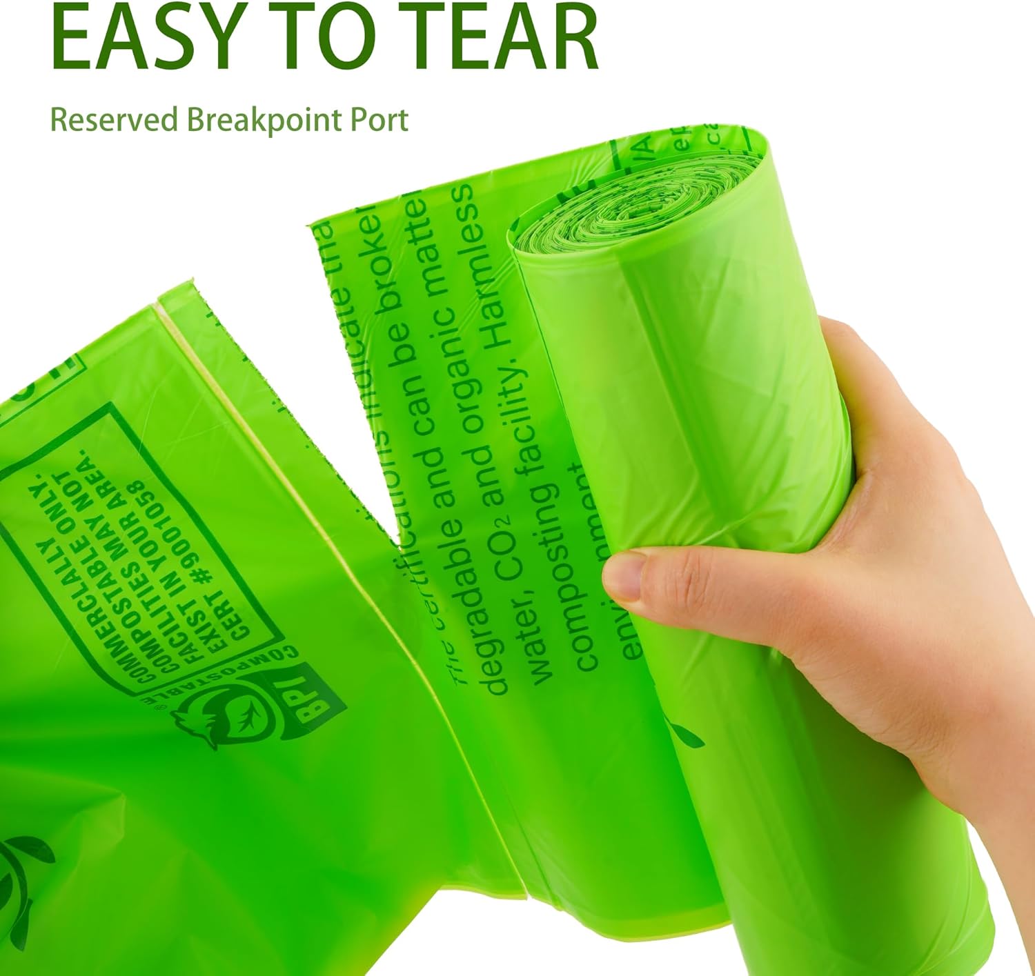 • CERTIFIED COMPOSTABLE IN U.S. & EUROPE:Our biodegradable garbage bags are certified to american standard ASTM D6400 (BPI) and european standard EN 13432 (ok compost home), guaranteed to be biodegradable in home composting facilities