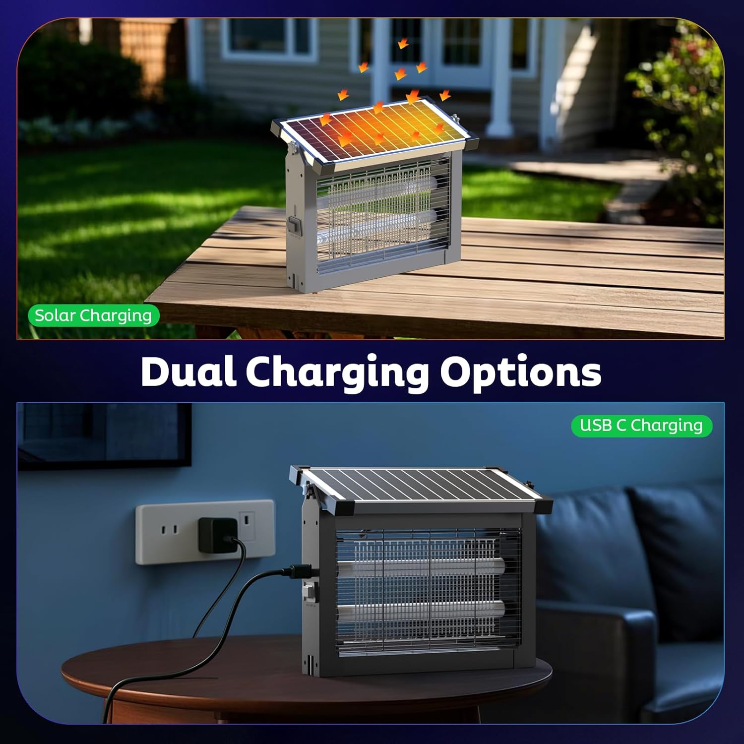 • Dual Charging Options: Solar & USB Powered: This solar powered mosquito zapper features a 10W 5V monocrystalline solar panel and a 4,000mAh rechargeable battery for eco-friendly, energy-efficient operation. Charge it with direct sunlight for sustainable use, or quickly recharge via USB using the included 4ft USB-C cable in just 3-4 hours. Enjoy up to 12 hours of continuous protection on a full charge. Ideal for both indoor and outdoor use, whether at home, in an RV, camping, or in your backyard