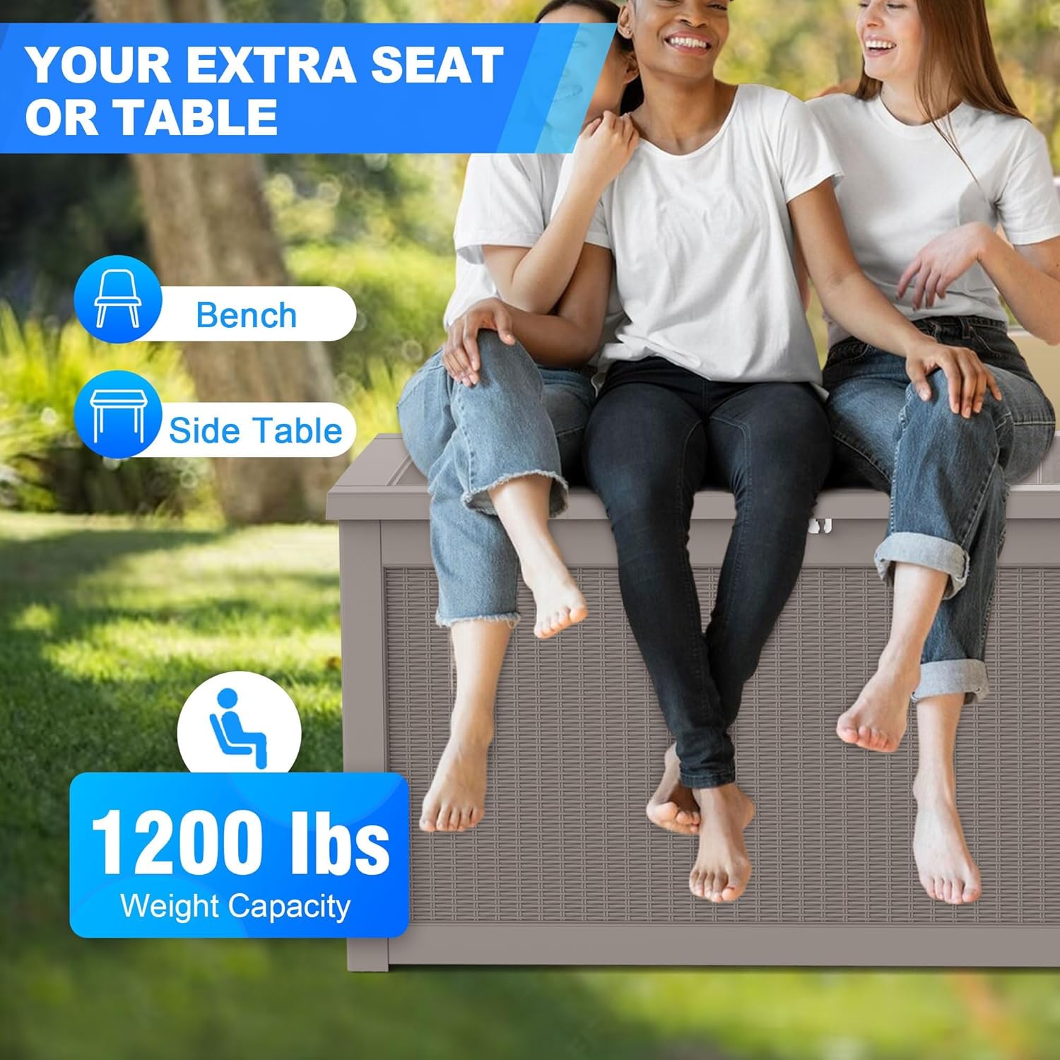• Versatile Storage with Large Capacity Our deck box offers an impressive storage capacity, perfect for organizing patio cushions, gardening tools, pool accessories, and more. This multipurpose storage solution not only helps keep your outdoor space tidy but also functions as a bench or table. Whether in your backyard, by the pool, or on the patio, this deck box is designed to meet your every need.