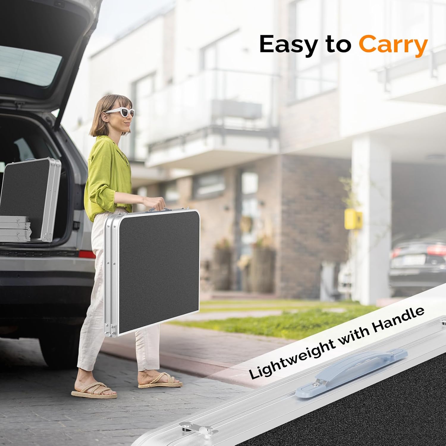• LIGHTWEIGHT&FOLDABLE: MDF tabletop and aluminum feet make its weight just 8.1 lbs. The feet could be set off and tabletop could fold in half, foldable like suitcase(23.6”*17.7”). It is convenient to carry it to anywhere with its soft carry handle.