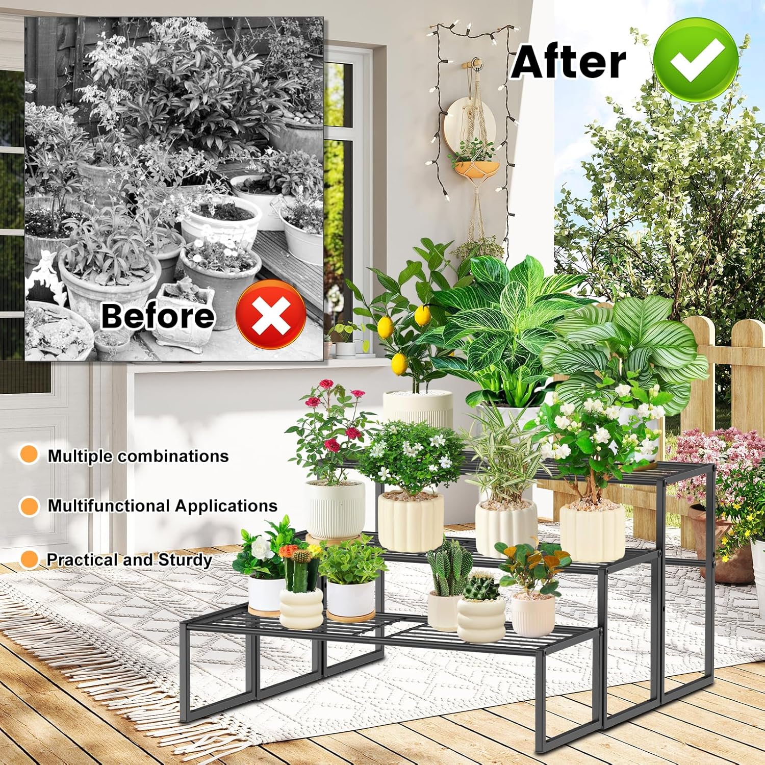 • 【Sturdy & Stable 】 The metal plant shelf is made of thicker iron pipes, stable structure, strong load-bearing capacity, can easily accommodate multiple flower pots and plants. The Black coating surface is waterproof and rust-proof to adapt to various weather conditions.