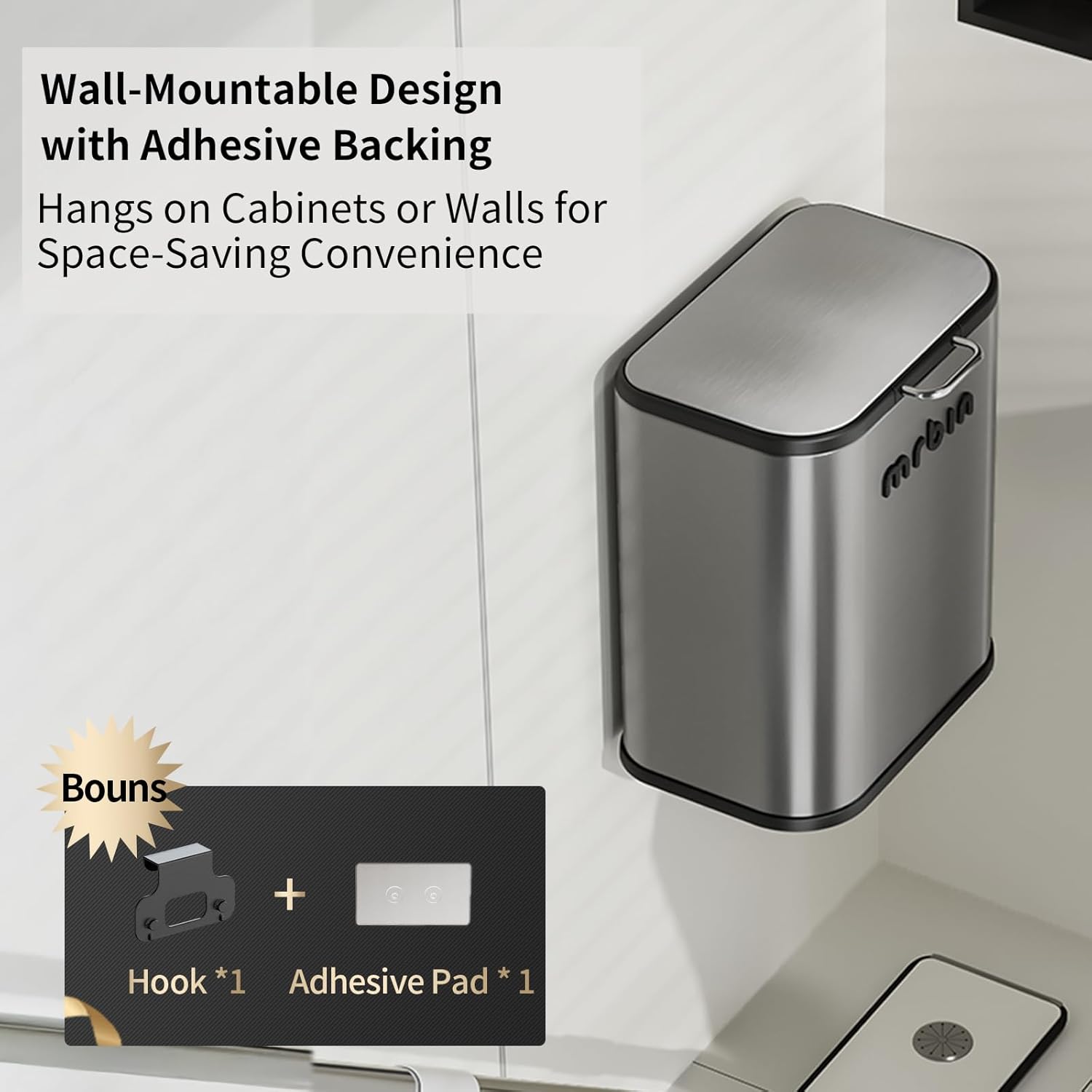 MRBIN Kitchen Stainless Steel Compost Bin with Lid Countertop, 6l / 1.6gal Small Indoor Hanging Trash Can for Cabinet Door, Small Under Sink Food Scraps Garbage Pail, Eclipse-Grey
