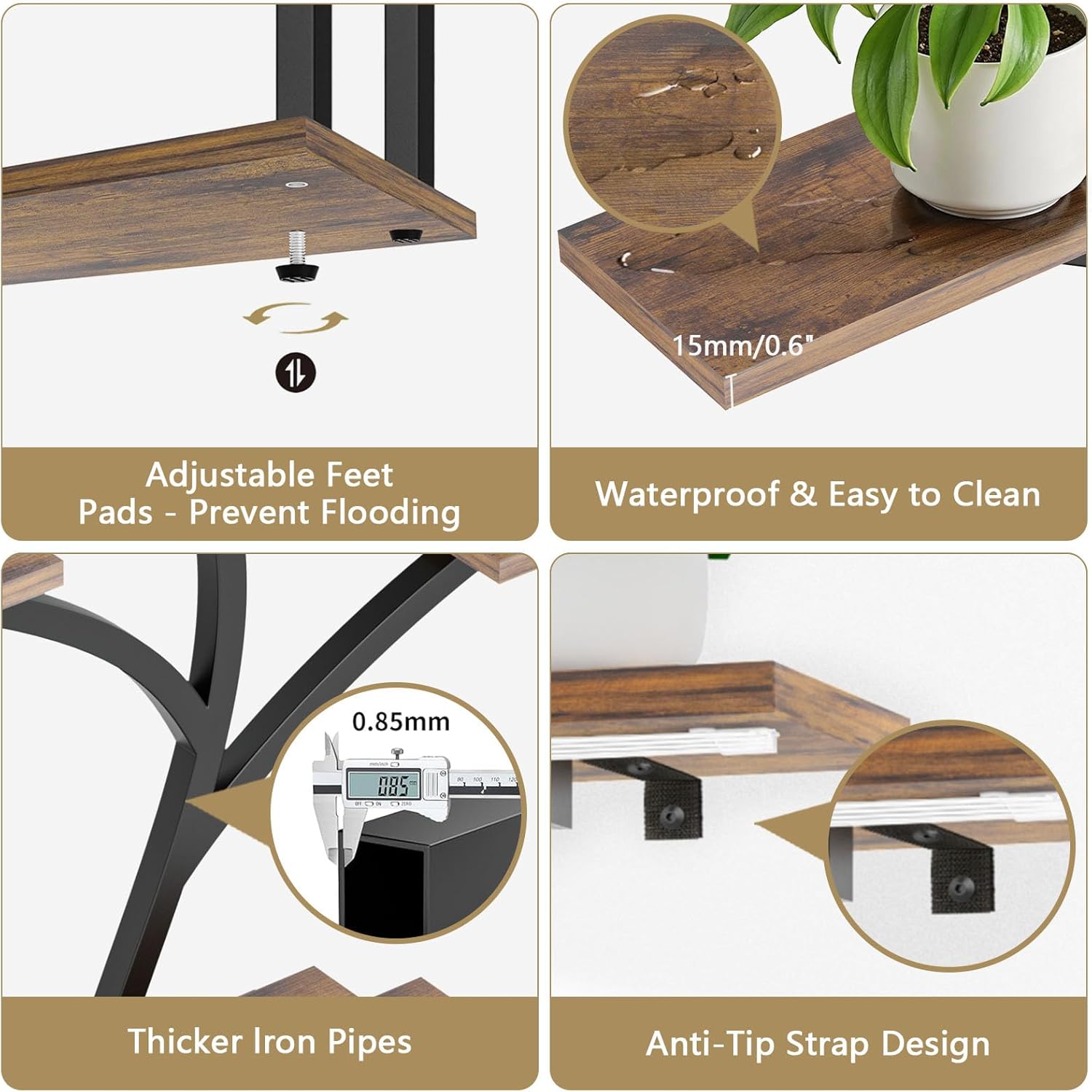 • 【Stable and Long-lasting】This tiered plant stand indoor features a sturdy frame made of 0.85mm thick heavy-duty rust-proof iron pipe with strong load-bearing capacity, paired with 15mm high quality particle board, the surface is coated with a waterproof coating, easy to clean and helps prevent corrosion, warping and curling. The design of this plant rack is inspired by lush vines, adding a touch of tranquility and fashion to any space.