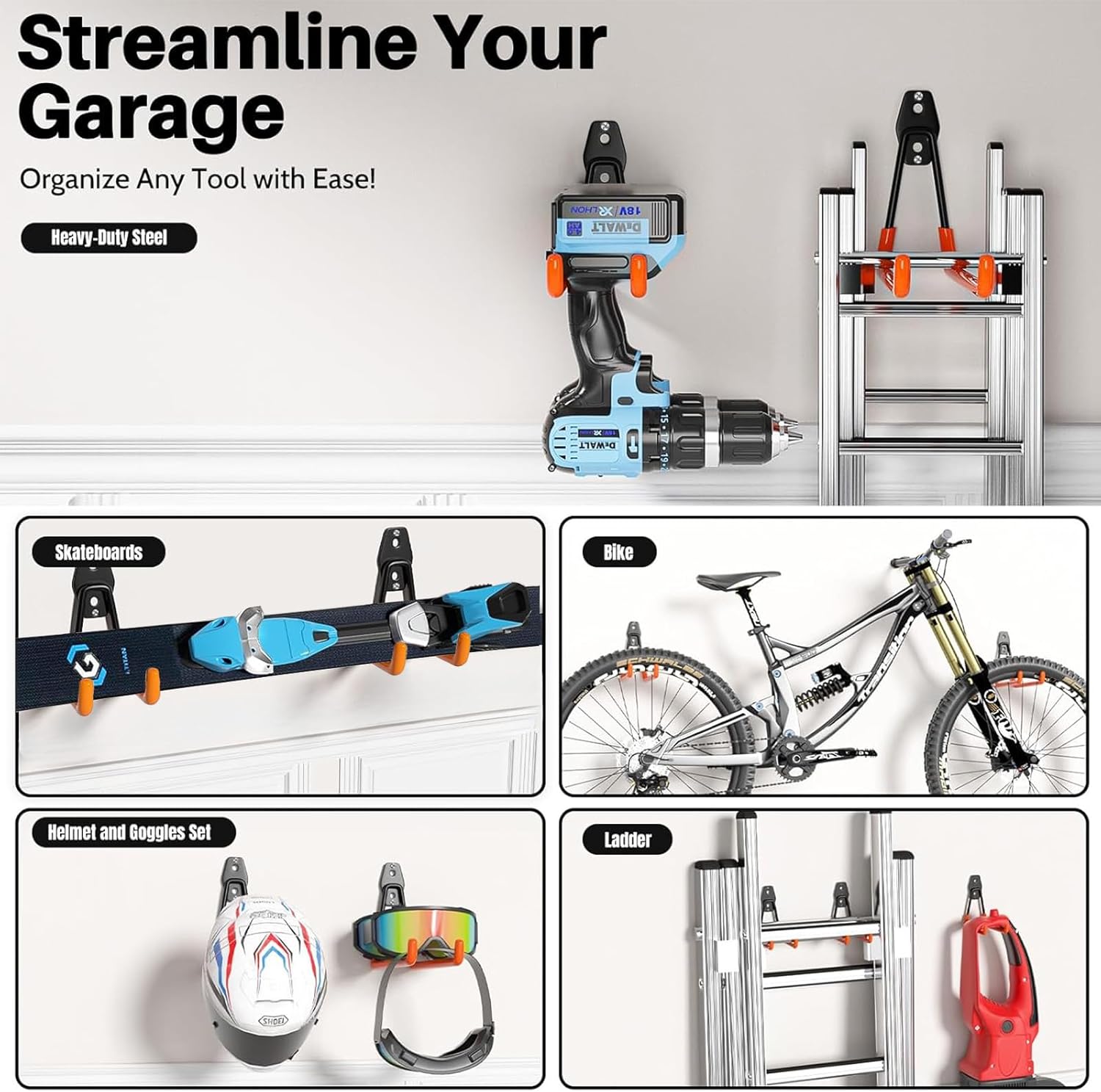 • WEATHERPROOF& DURABLE- Rain or shine, this garage storage hooks stands strong! Its surface is treated with a special spray and dip coating process, ensuring it's waterproof, slip-proof, scratch-resistant, and built to withstand whatever nature throws its way