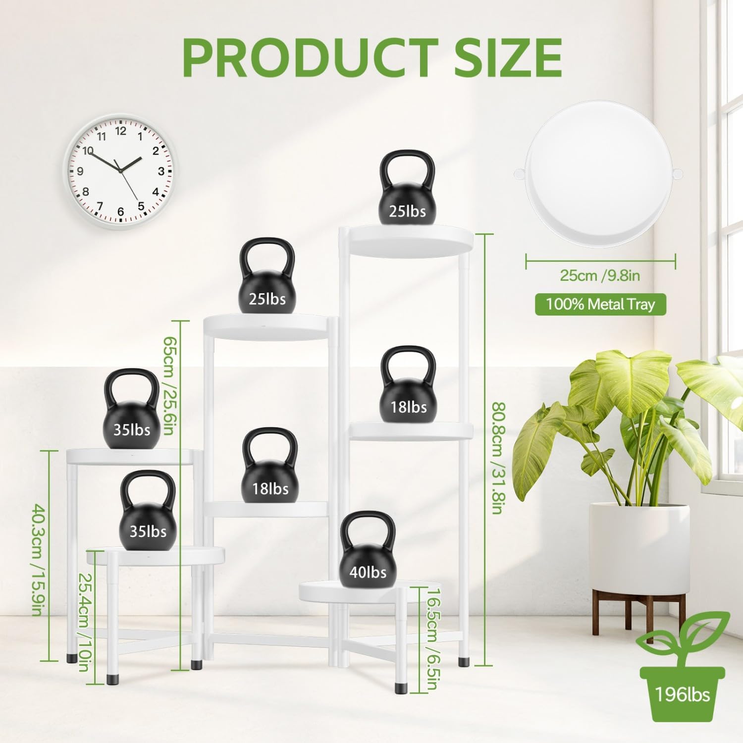 • 9.8 In Extra Wide Round Tray: This corner plant stands for indoor plants has been upgraded with an enlarged 9.8-inch diameter metal round tray with a total weight capacity of 196 lbs for large & heavy duty potted plants. The tiered plant stand is made of sturdy and durable iron with a waterproof and rustproof white lacquer finish, making it suitable for indoor and outdoor use