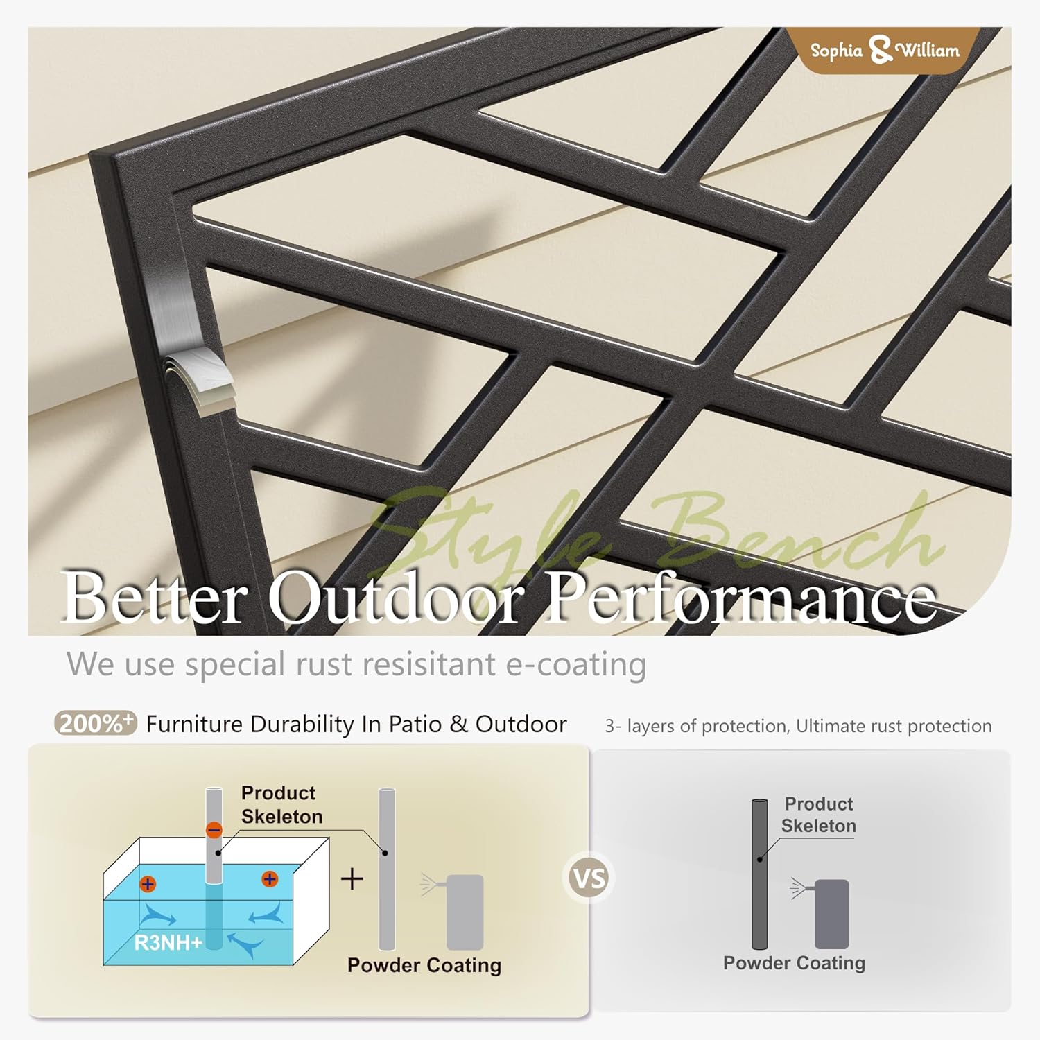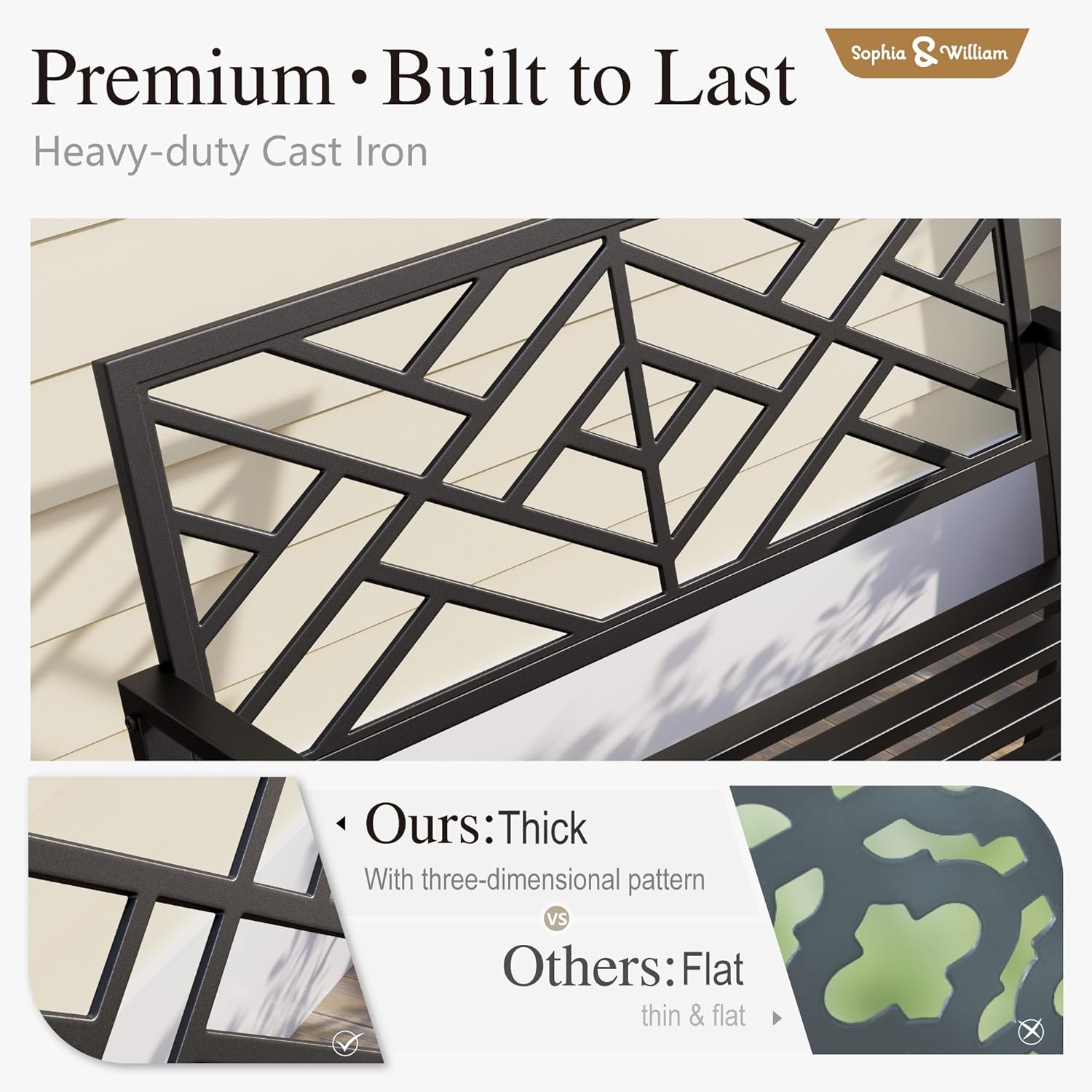 • Superior Material: The outdoor bench is made of Cast Iron to ensure sturdiness and stability, making it heavy-duty oriented and durable enough for long-term use. The surface comes with special e-coating for rust resistance and weather resistance, all edges are finished, super smooth and no raw cuts or drips to catch on clothing