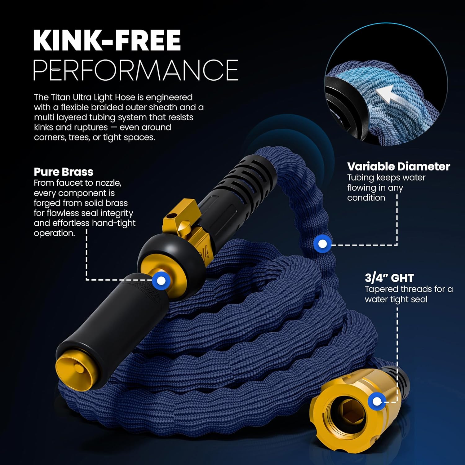 • [Feather-Light, Super Strong] Redefining watering with its incredibly lightweight design, experience unmatched watering efficiency with our Titan garden hose. When paired with our precision-engineered nozzle, this hose delivers exceptional pressure for everyday watering tasks while saving you water. Ideal for garden maintenance, vehicle cleaning, RV, marine use and more, for a powerful and consistent water flow.