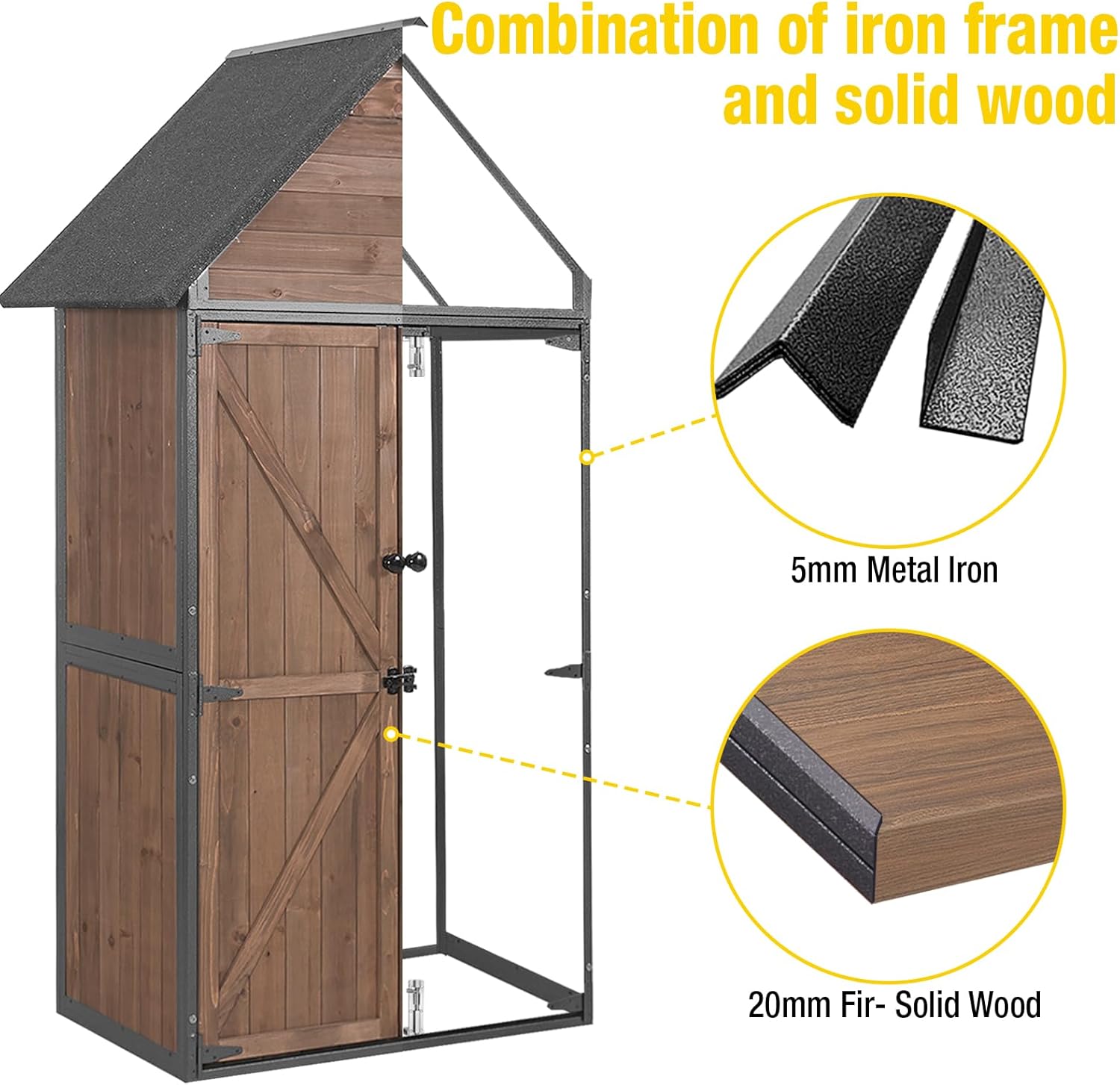 • Sturdy Metal Frame:Using a high-strength metal frame combined with natural quality wood this storage shed not only has load-bearing capacity and corrosion resistance,,strong enough to withstand strong wind and rain and animal damage. its elegant wood texture is more integrated into the outdoor environment, becoming the finishing touch of the garden and yard. Take full care of your garden tools and outdoor supplies