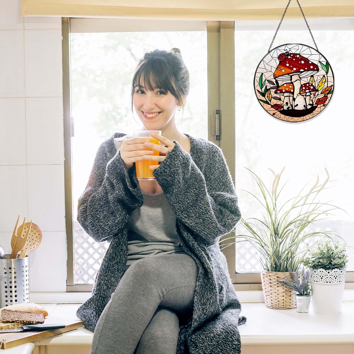 Mushroom Forest Sun Catcher Stained Glass Window Hanging Mushroom Lover Gifts for Women Wall Decor Handmade Sun Catcher Decoration for Home Graden Housewarming Gifts
