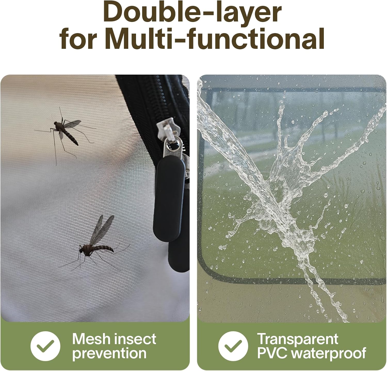 • All-Weather Ready: Built for all four seasons, this pop up tent shields you from rain, wind, and insects. Use the mosquito-proof mesh for breezy backyard lounging or rely on the waterproof PVC layer for storm protection—versatility meets durability. And the built-in fabric side doubles as a sunshade sail—no extra purchase needed! Block sunlight, prevent sunburn, and enjoy added privacy.