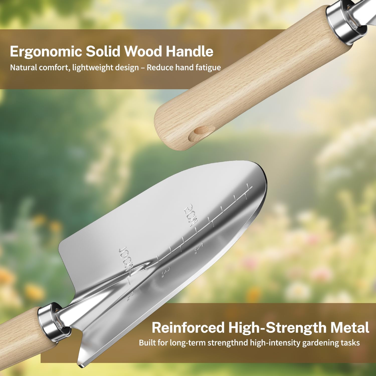 • 【Timeless Tools for Lifelong Gardening】Our high-quality stainless steel tools feature a smooth, non-porous surface that resists dirt, rust, and corrosion. With just a quick rinse and a light wipe, they'll stay looking brand new. Say goodbye to tools that wear out quickly—these will keep their shine for years to come.