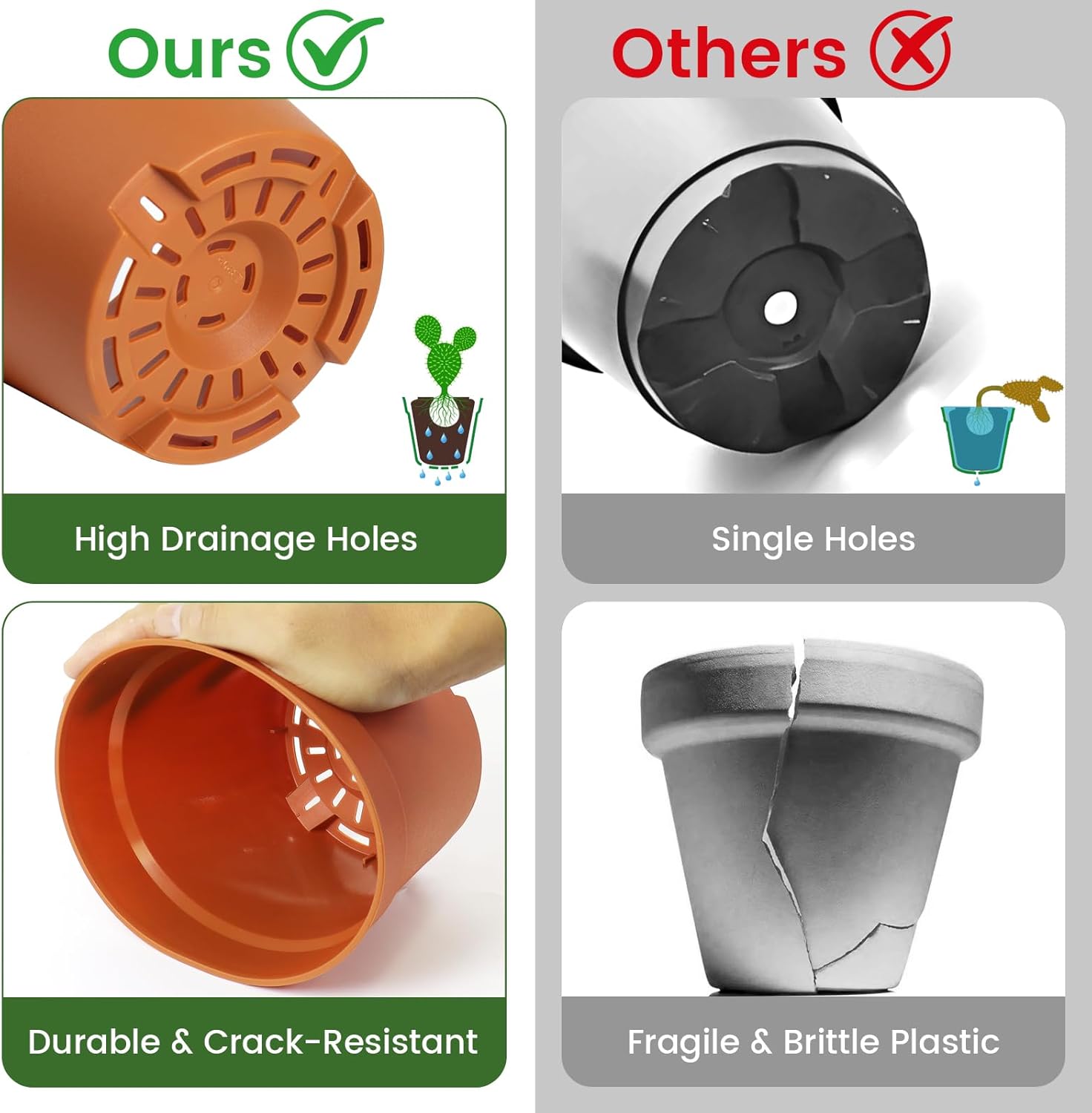 • [Drainage System Designed for Healthy Roots] These 6 inch plant pots feature multiple drainage holes at the bottom to promote airflow and prevent waterlogging. Matching saucers help catch excess water and reduce mess, making them ideal plant pots with drainage for both indoor and outdoor use.