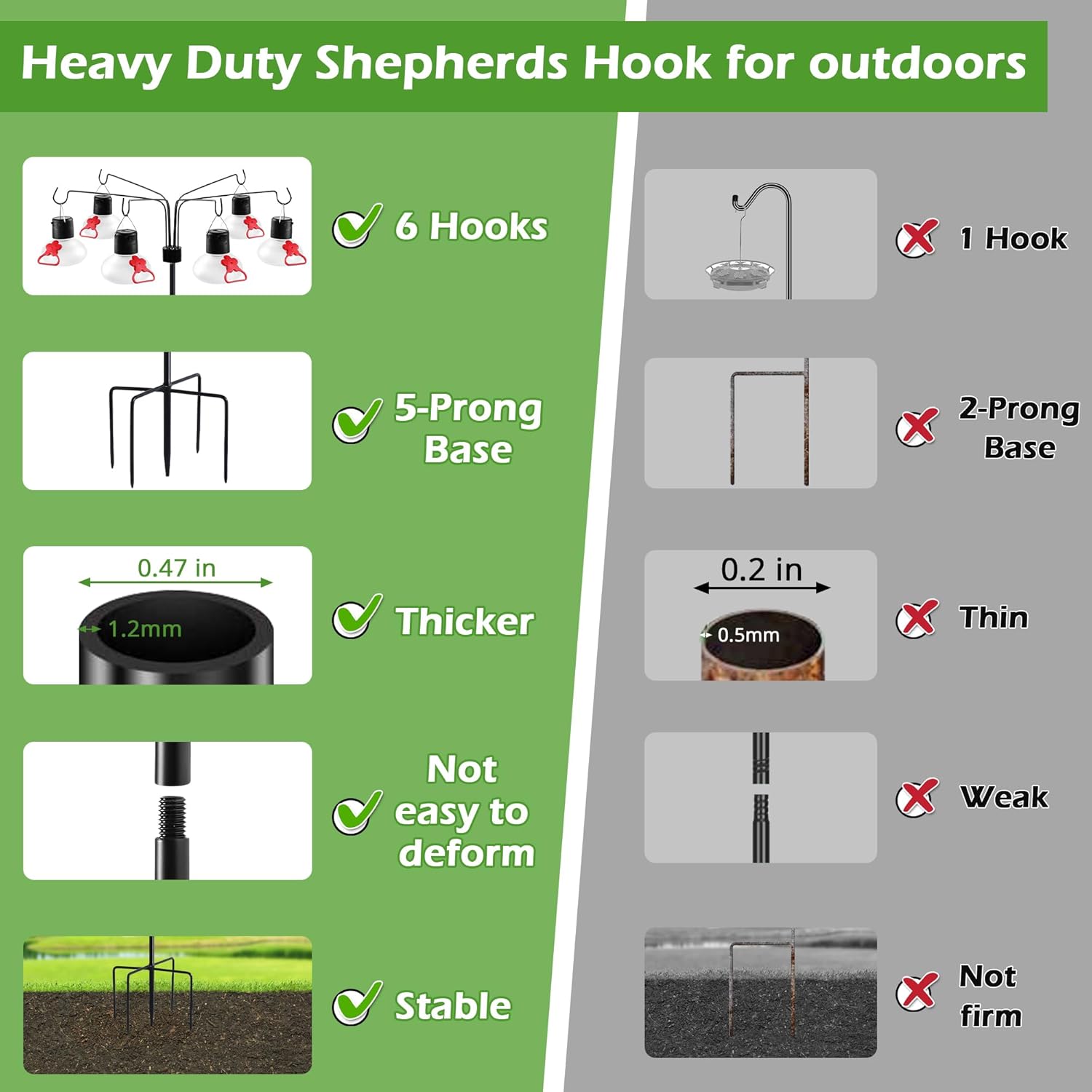 • Easy to Install and Refill:Installation is so easy;The wide-mouth glass globe makes filling and cleaning effortless.Pair it with our 47-inch Shepherd's Hook and 5-claw ground grip for a sturdy and practical setup;No wires needed;Just turn on the switch during the day for automatic charging,and it will light up automatically for 6-8 hours at night