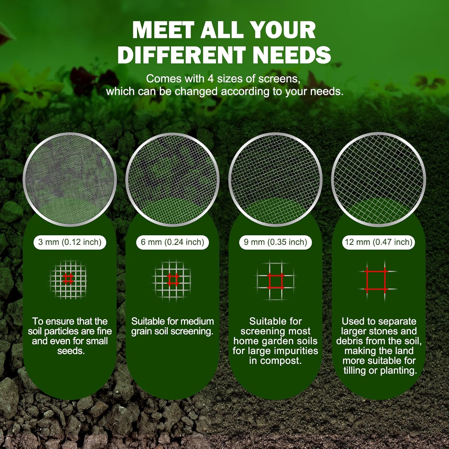 • Our soil sifter for gardening contains 4 removable compost sifter sizes (0.12/0.24/0.35/0.47in): 0.12 Inch: fine soil, suitable for small seeds, houseplants. 0.24 Inch: medium grain, suitable for vegetables (e.g. tomatoes, eggplants). 0.35 Inch: for home garden soil, suitable for ornamental plants (e.g. roses). 0.47 Inch: Provides good permeability, suitable for fruit tree planting