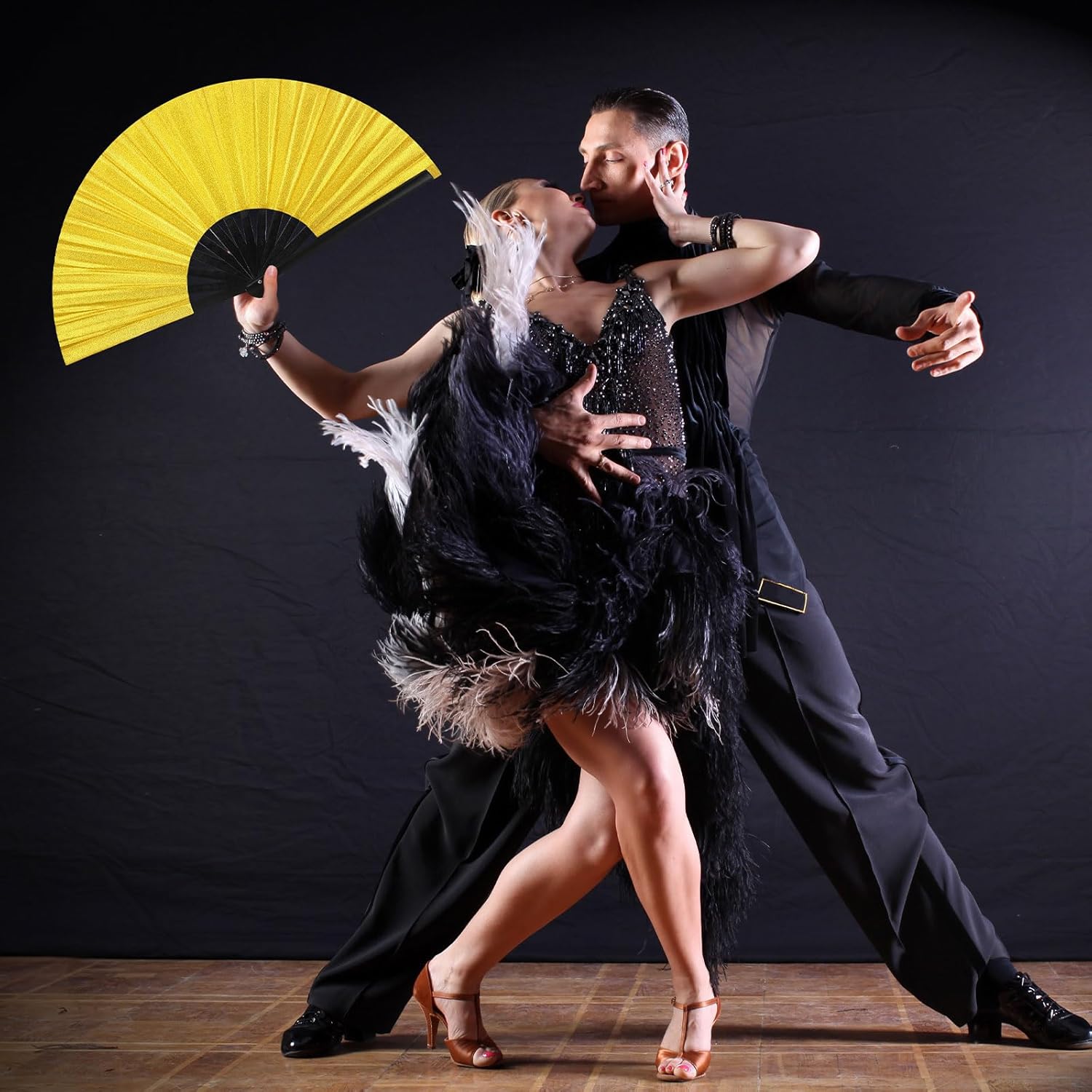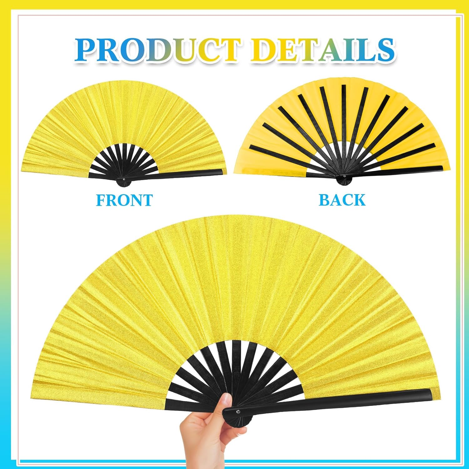 Maitys 2 Packs Large Clap Fans for Line Dancing Large Chinese Folding Hand Fans for Men and Women, Festival, Tai Ji, Kungfu, Martial Art, Gifts (Glitter Yellow and Blue)