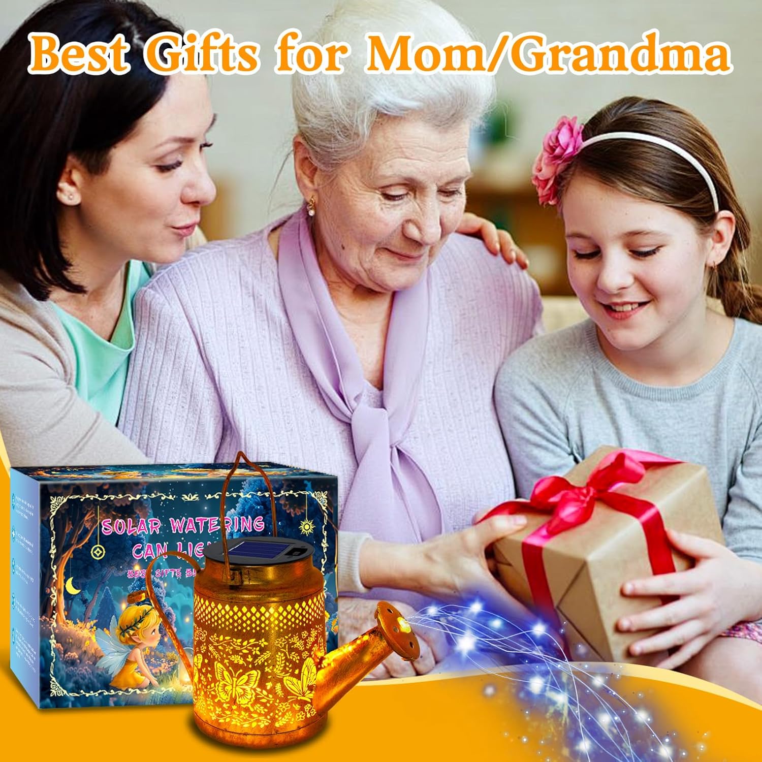 • Mom Gifts Solar Garden Lights -- This solar watering can with cascading lights is a perfect decoration for garden, yard, lawn, porch, patio, pathway, walkway, terrace, and balcony. You can place this outdoor decor for patio on the ground with the included Shepherd Hook to decorate your plants, vines, flower bed, or just hang it on a tree or placed on the tabletop