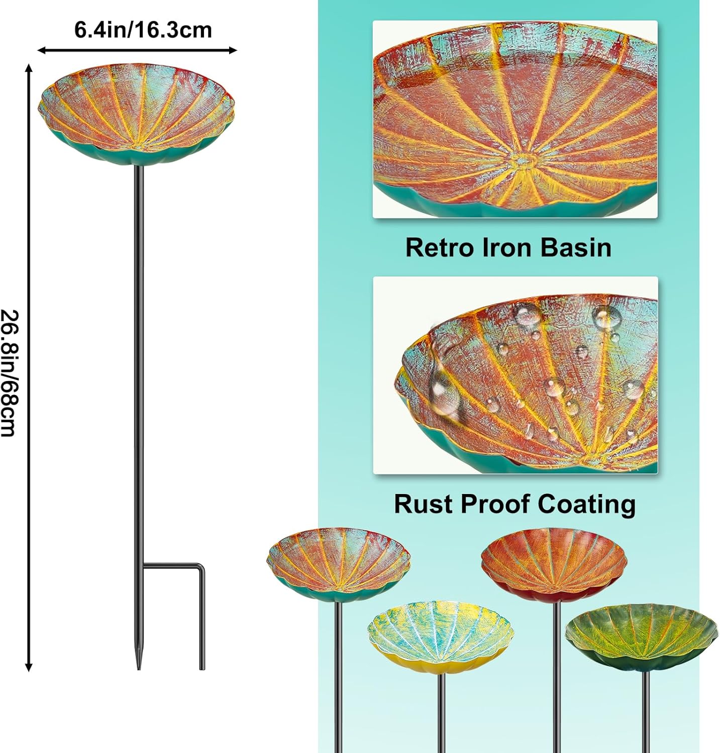 • Durable Design: The bird bath for outside is made of high quality material, waterproof, not easy to fade. The pole of the hummingbird birdbath is not easy to break, and the two sturdy tips allow the birdbath to stand firmly in the garden soil, can be used for a long time