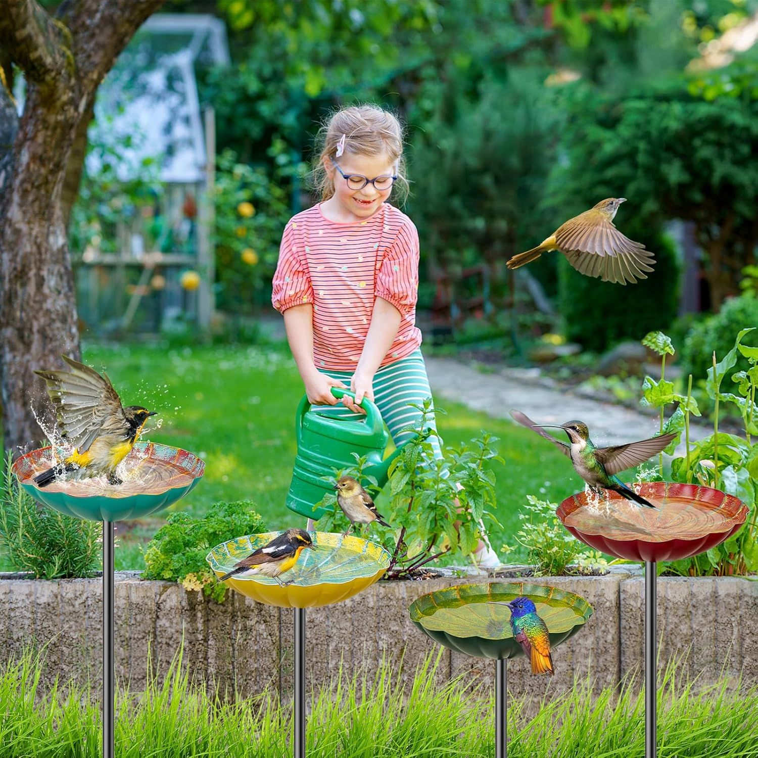 • Versatile Use:Not only can these free standing bird feeder & bird baths serve as a refreshing oasis for your feathered friends, but they can also double as a bird water feeder, making it easy to provide nourishment for various species, including hummingbirds.Adding stones or marbles in it as a bee watering station is also a good option